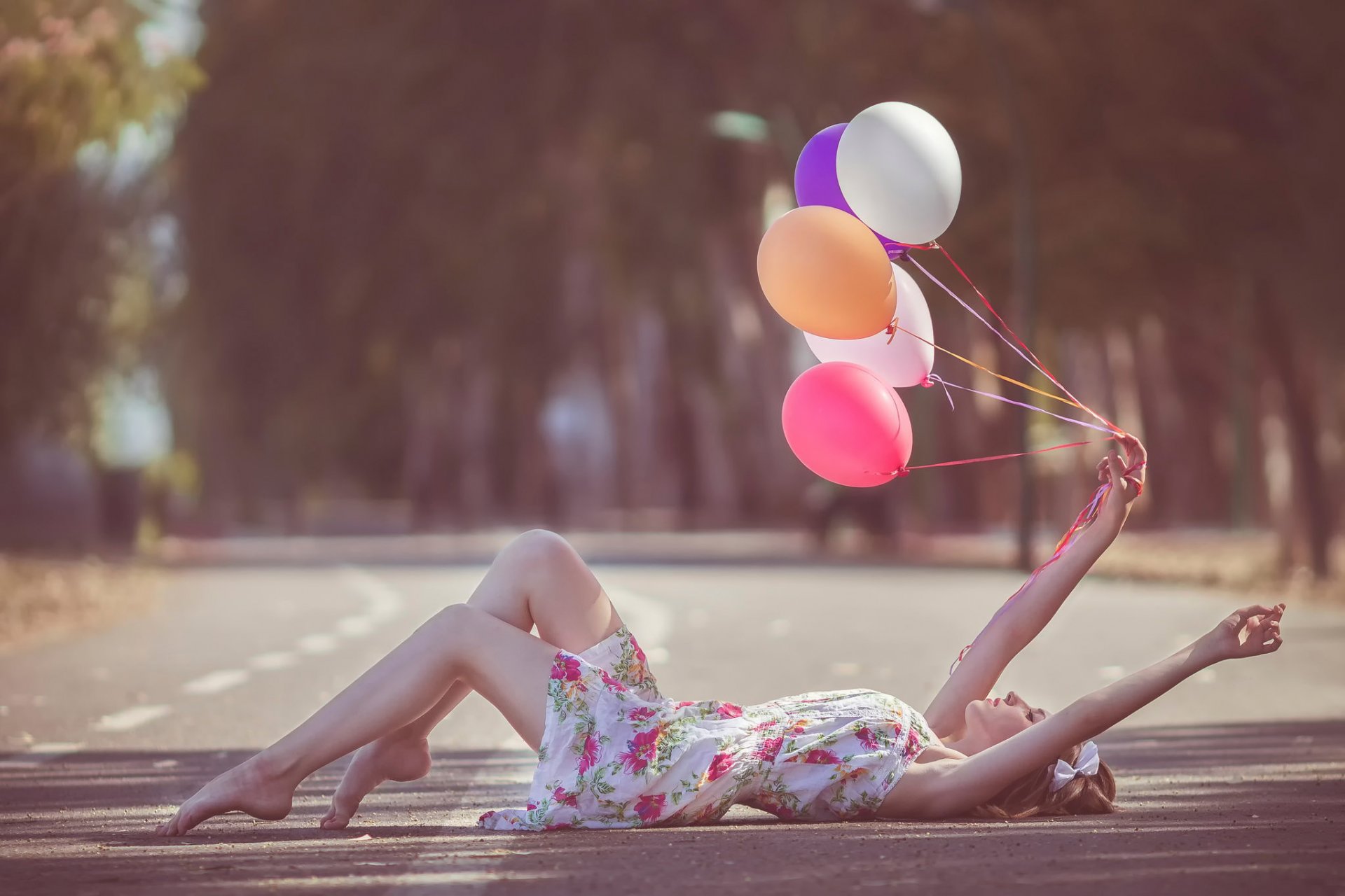 Девушка на дороге лежит с шарами