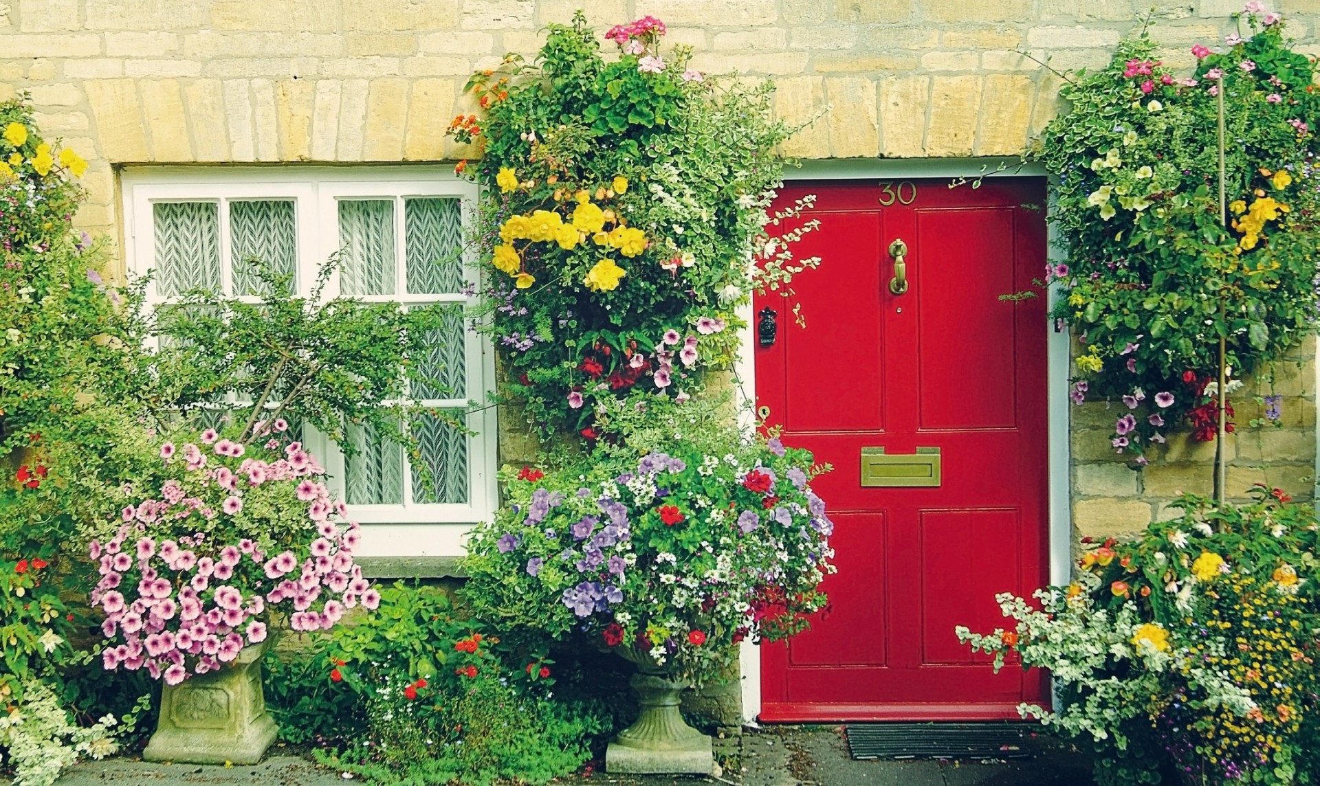 Здание с окном и дверью в цветах