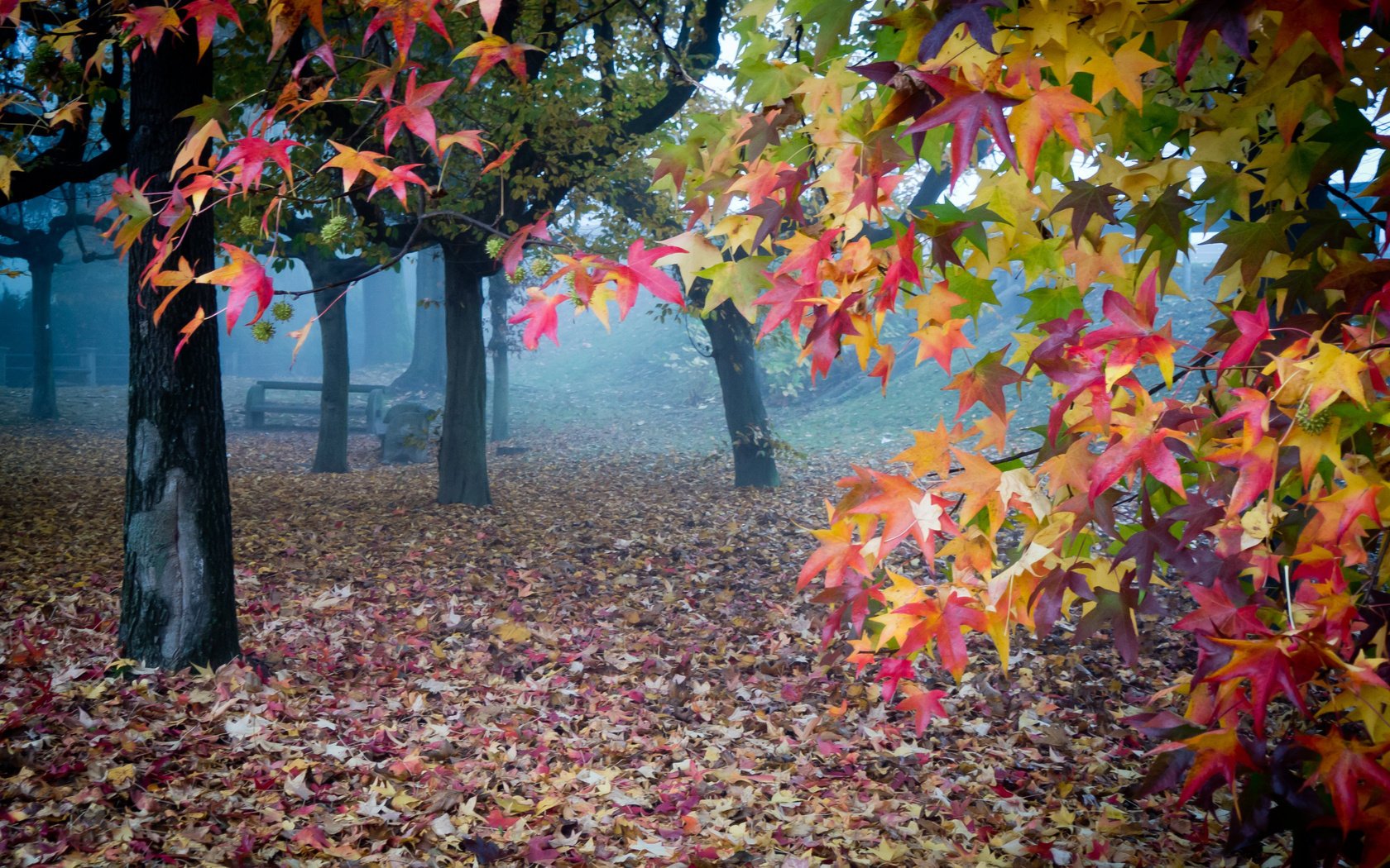 Осенние листья в туманном саду
