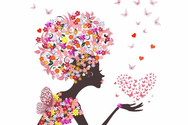 Абстакция девушка в цветах держащая на руке сердечко