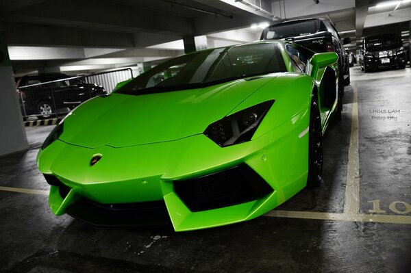 Зелёный автомобиль Ламборджини с авендатором