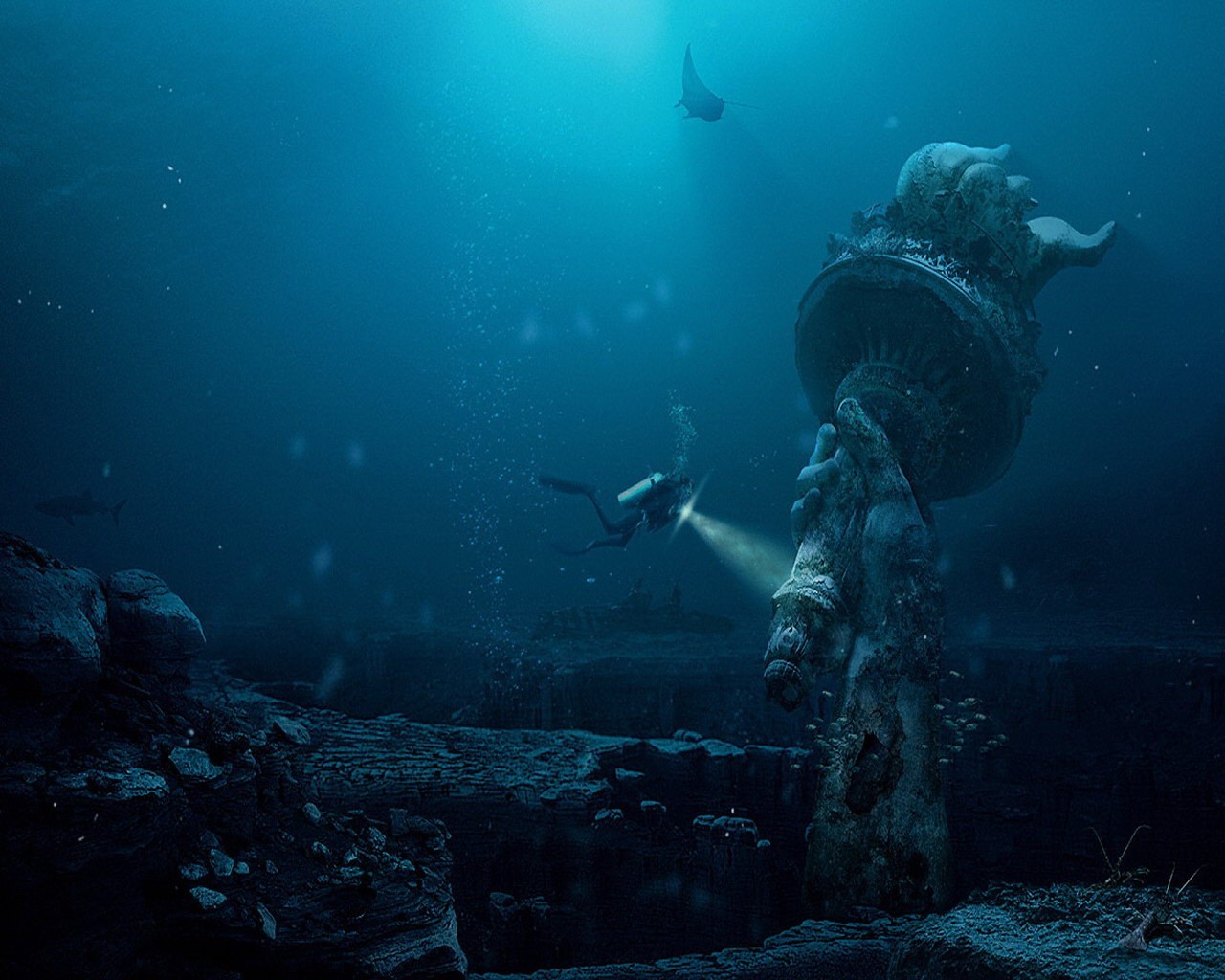 Аквалангист на дне океана на фоне огромного косяка рыб