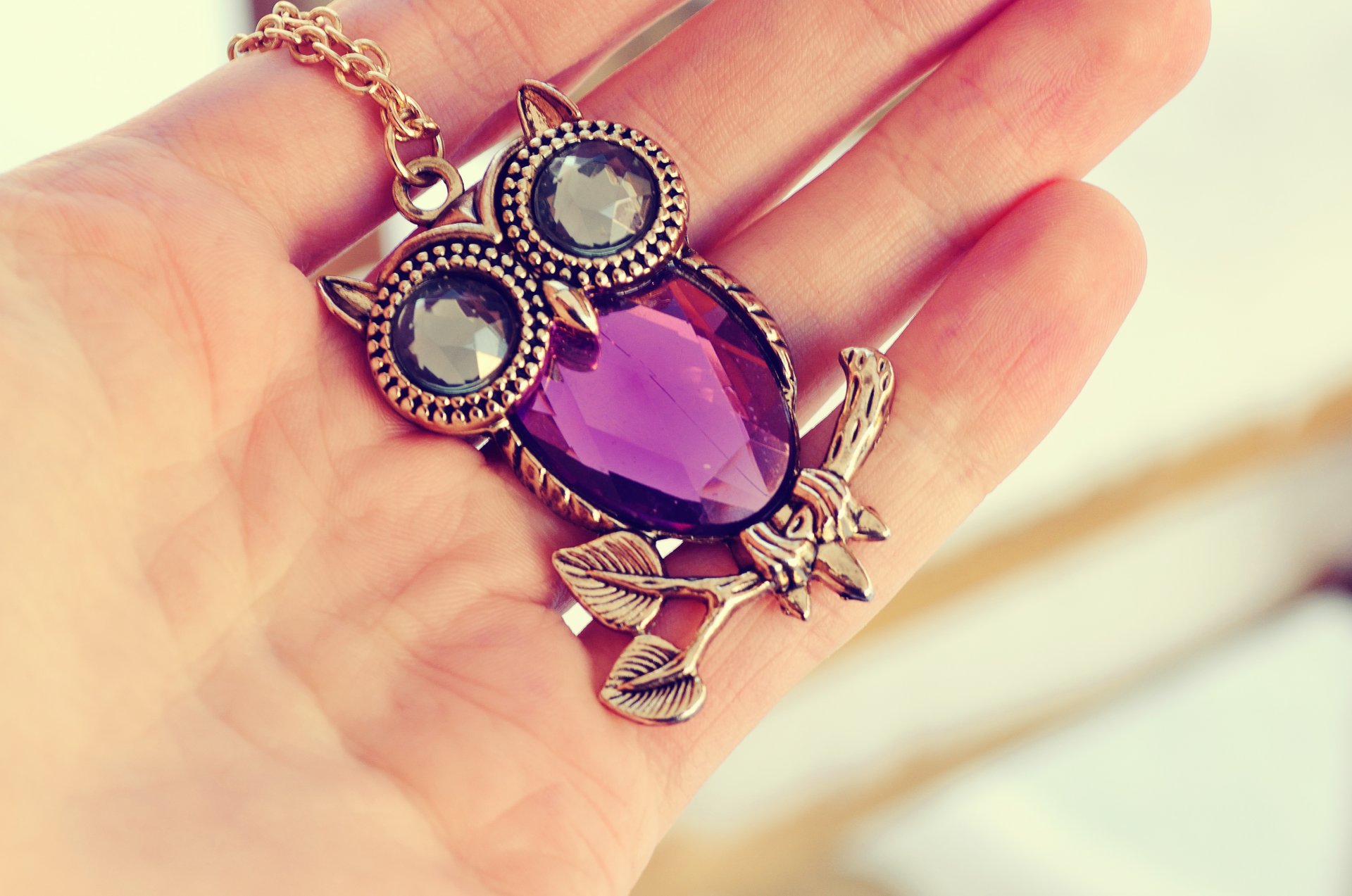 Кольцо из серебряного металла с фиолетовым камнем на фоне серой ткани