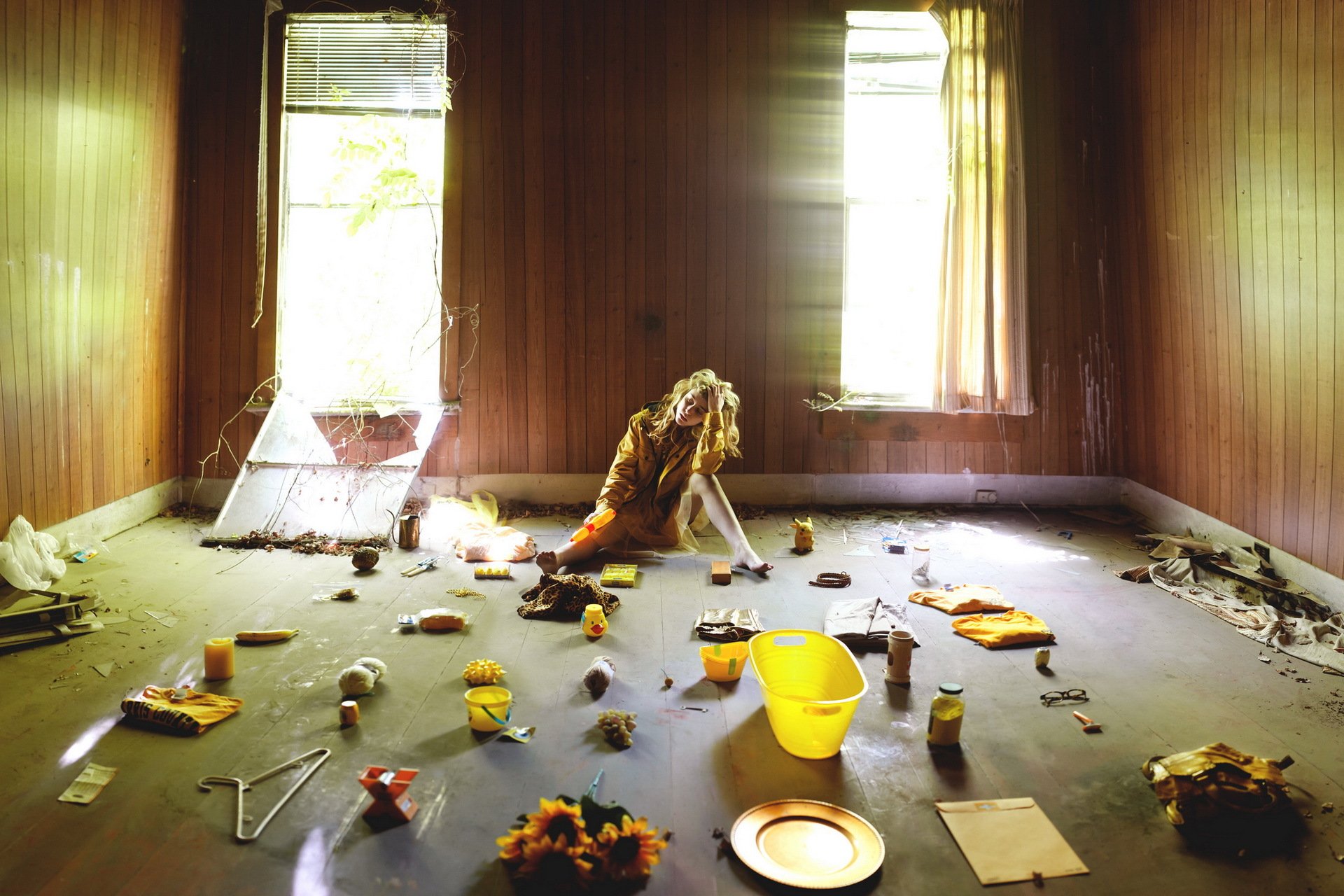 Девушка с жёлтыми волнистыми волосами и бантом в комнате с бардаком и раскрытыми окнами