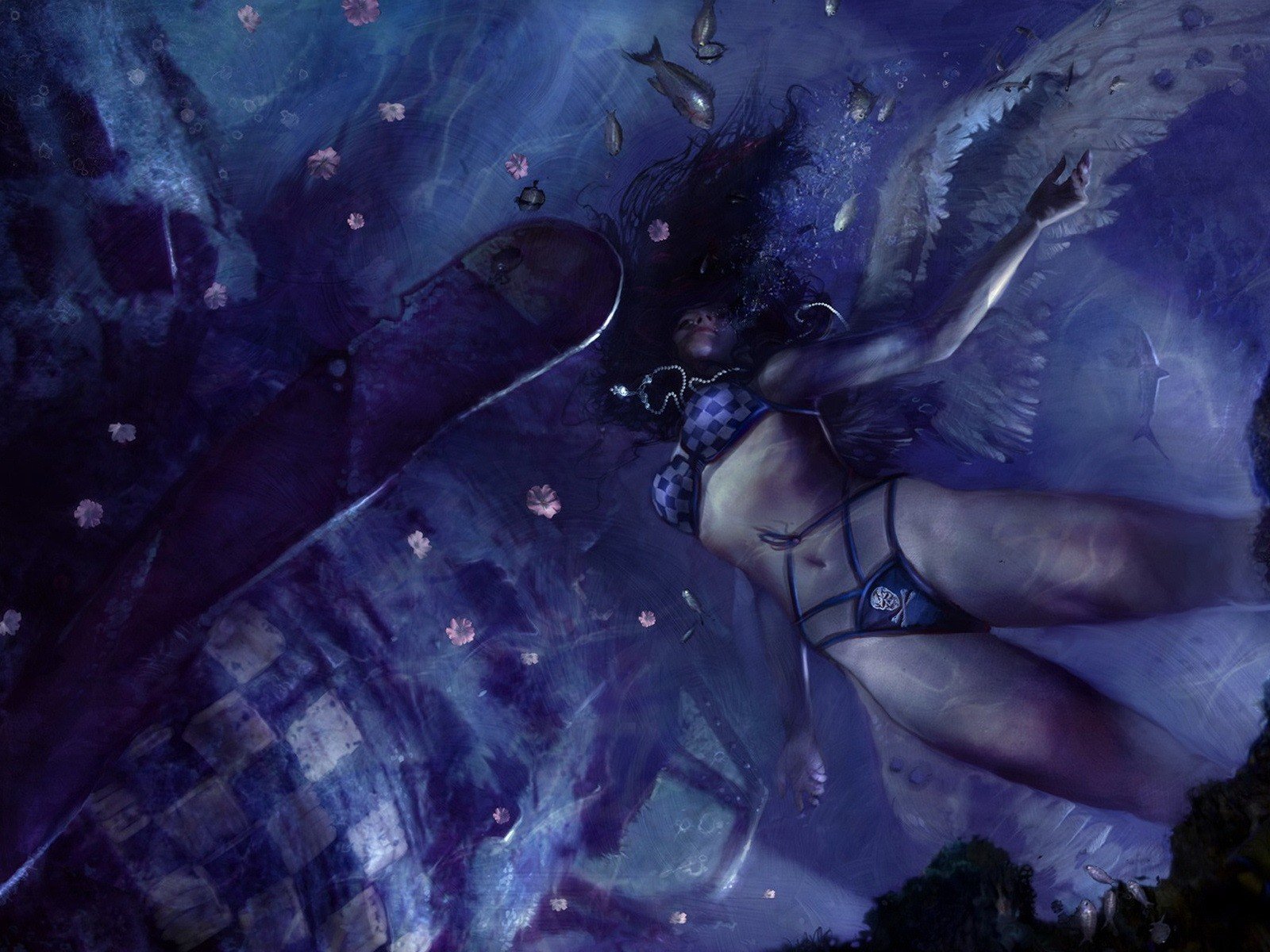 Девушка с крыльями в нижнем белье на синем фоне