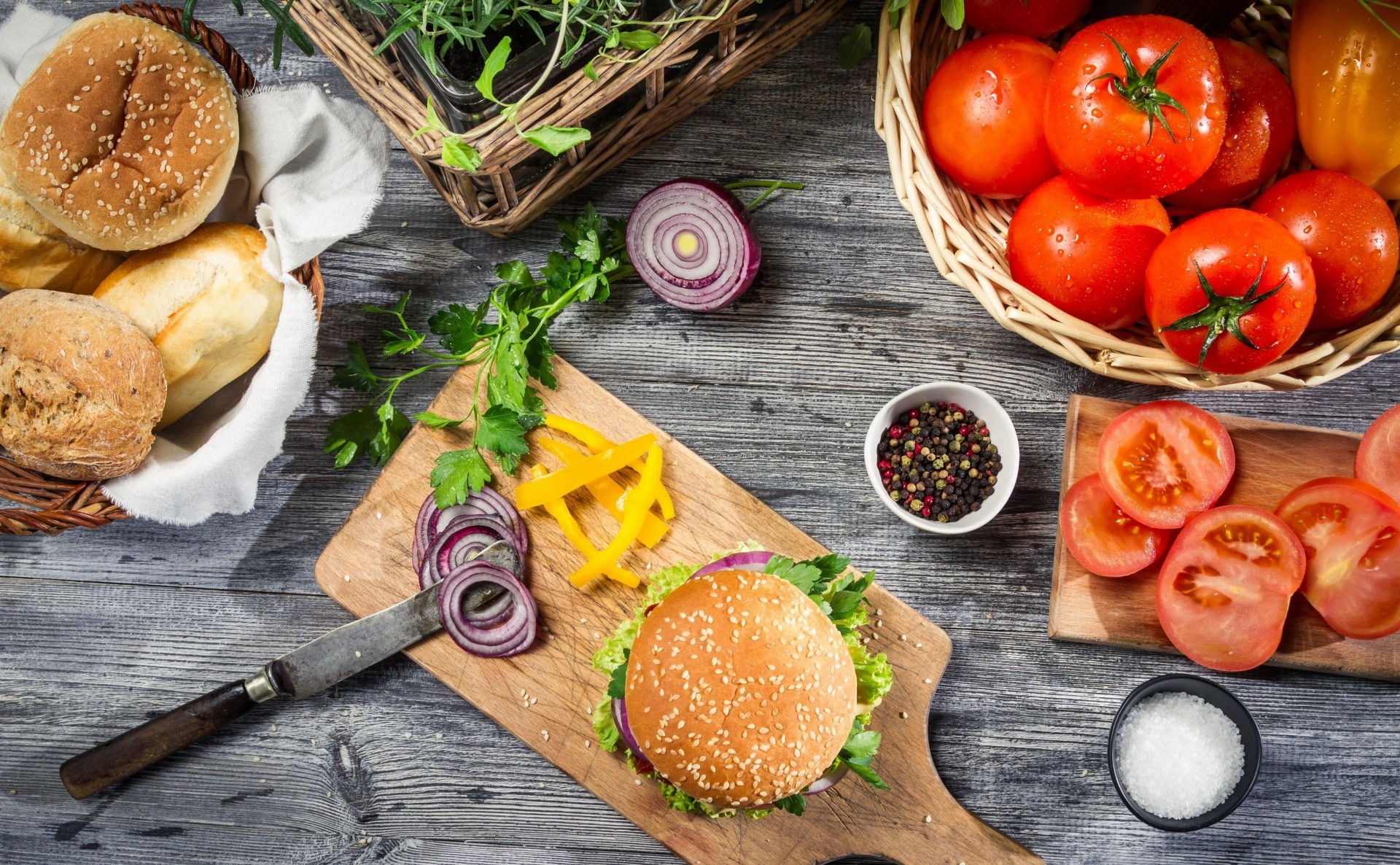 Бургер с котлетой, сыром, овощами и зеленью, ледащий на доске среди овощей и картофеля фри