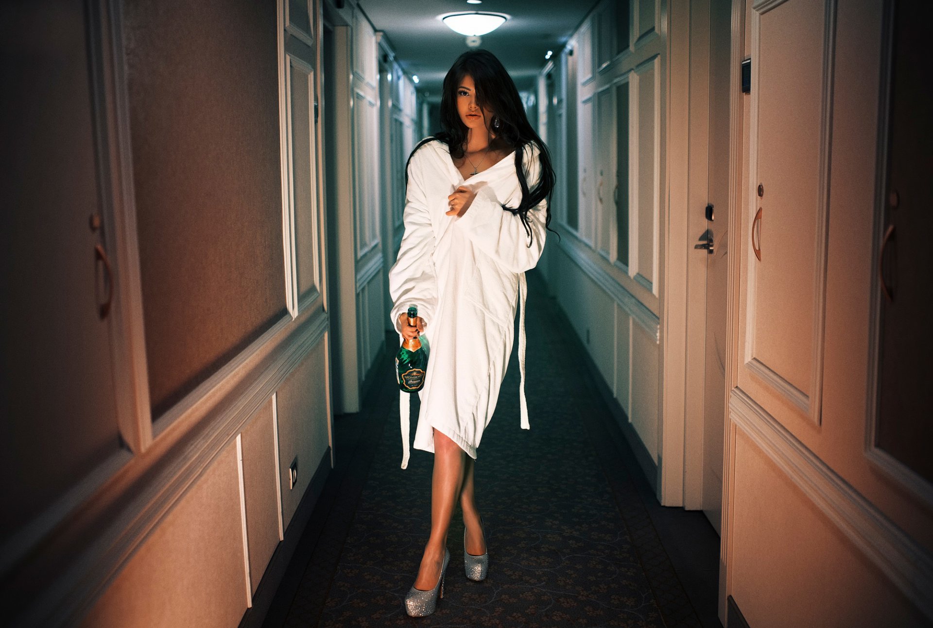 Девушка в халате с бутылкой шампанского идёт по коридору отеля