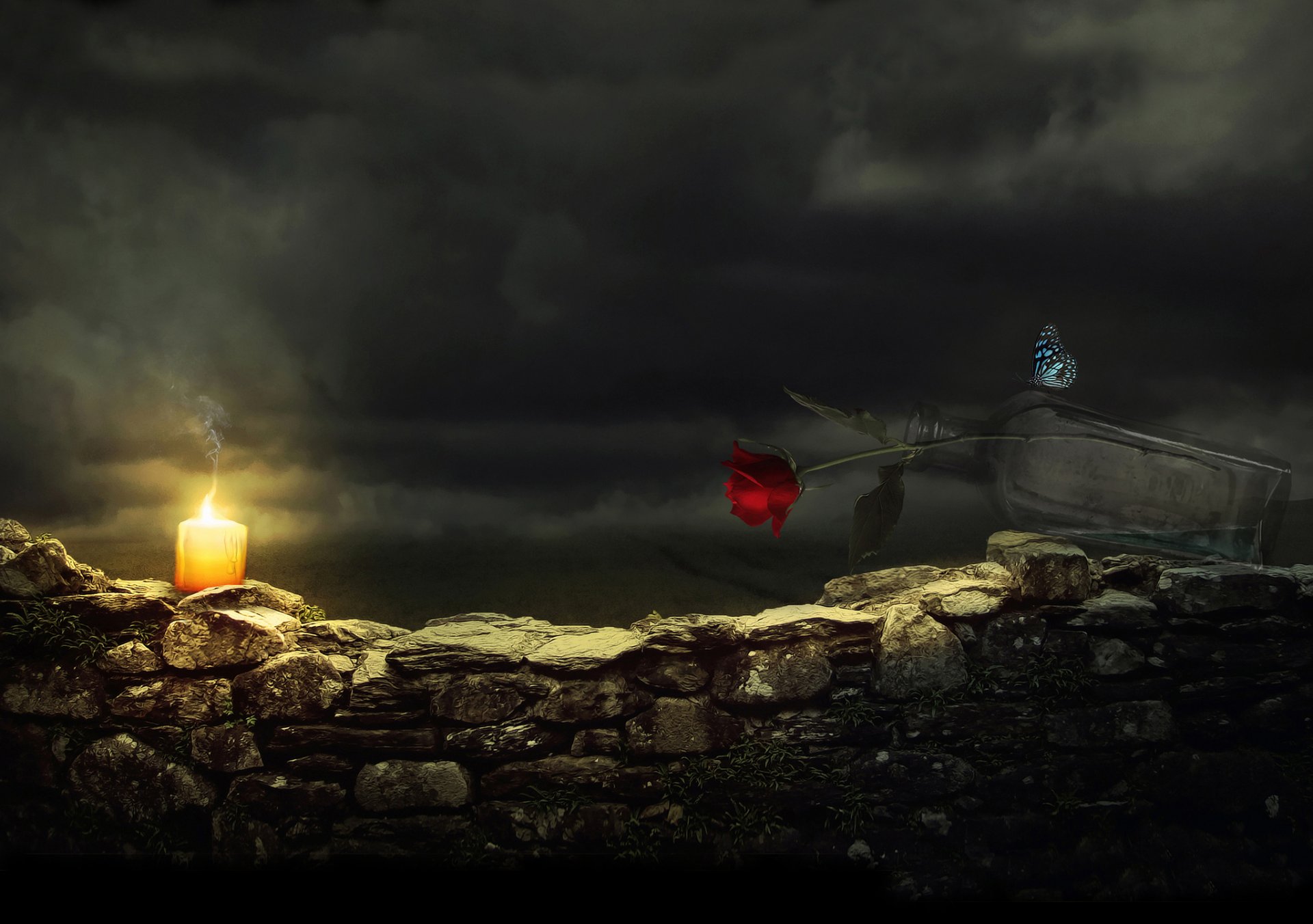 Свеча, бабочка и красная роза в бутылке на каменной изгороди ночью