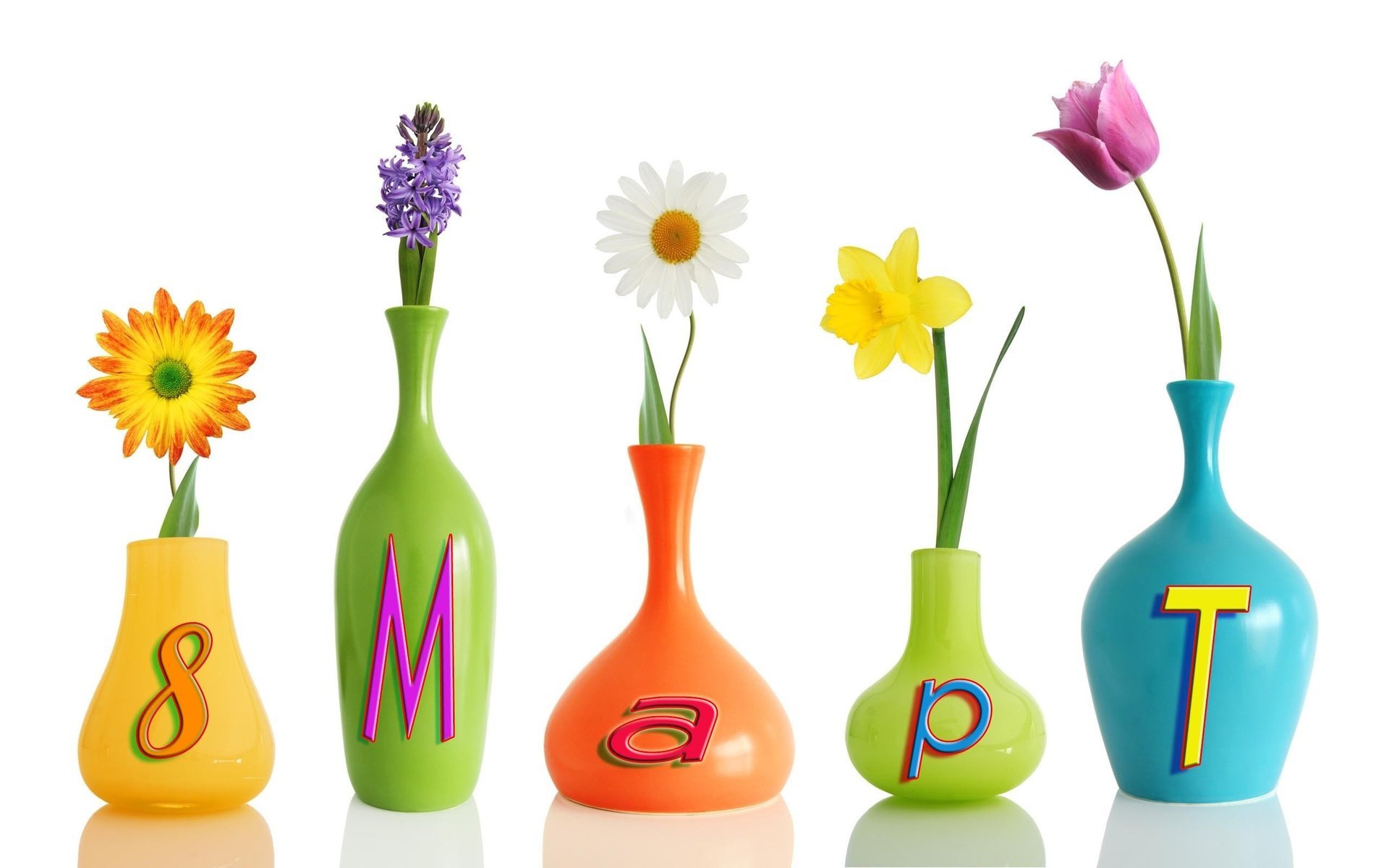 Пять вазочек разных цветов и размеров. В каждой вазе по цветочку