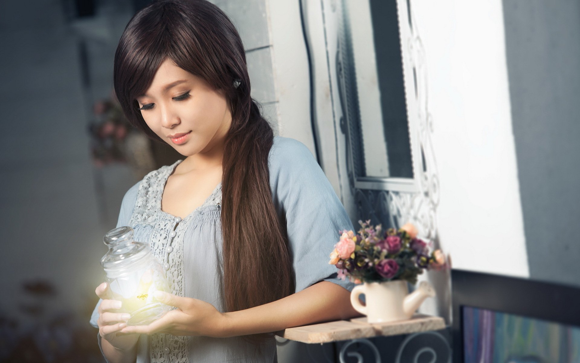 Красивая азиатка стоит у вазочки со цветами и нежно держит графин