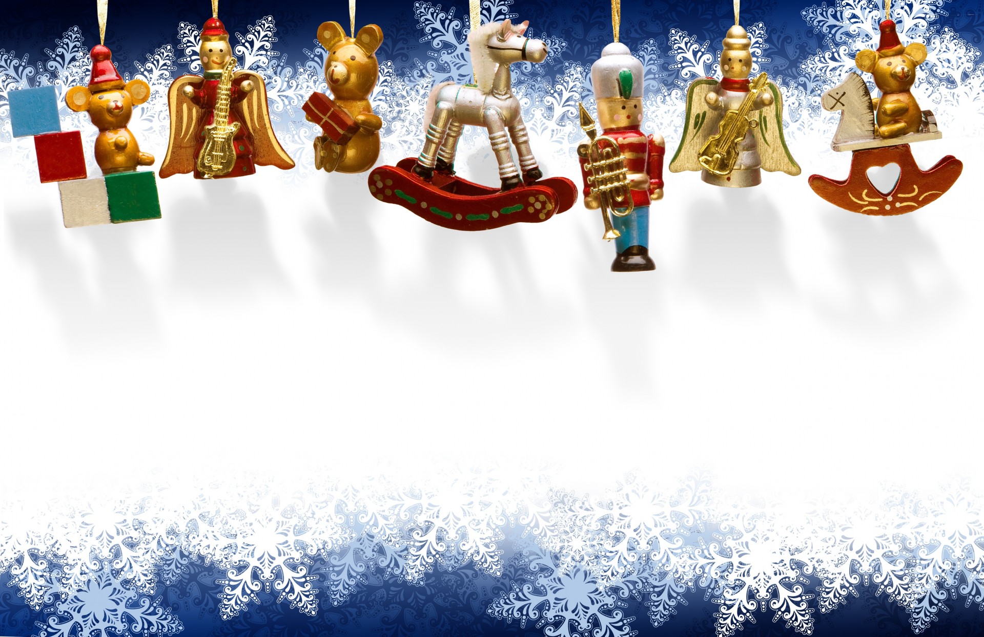 Новогодние игрушки в виде фигурок животных золотистого цвета в верхней части, посередине белый фон, сверху и внизу на синем фоне белые снежинки