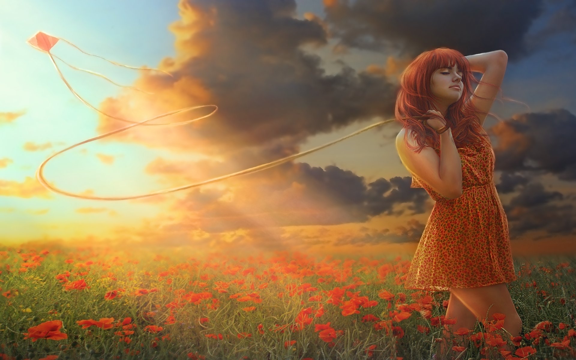 Девушка в поле красивых цветов с воздушным змеем