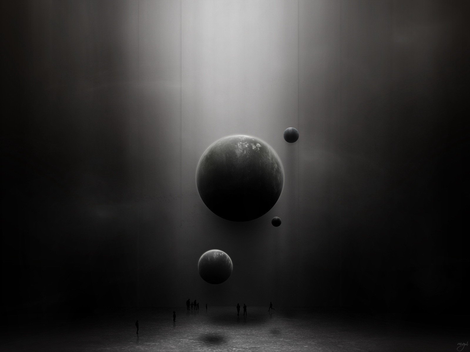 Чёрно-белые планеты и люди на выставке