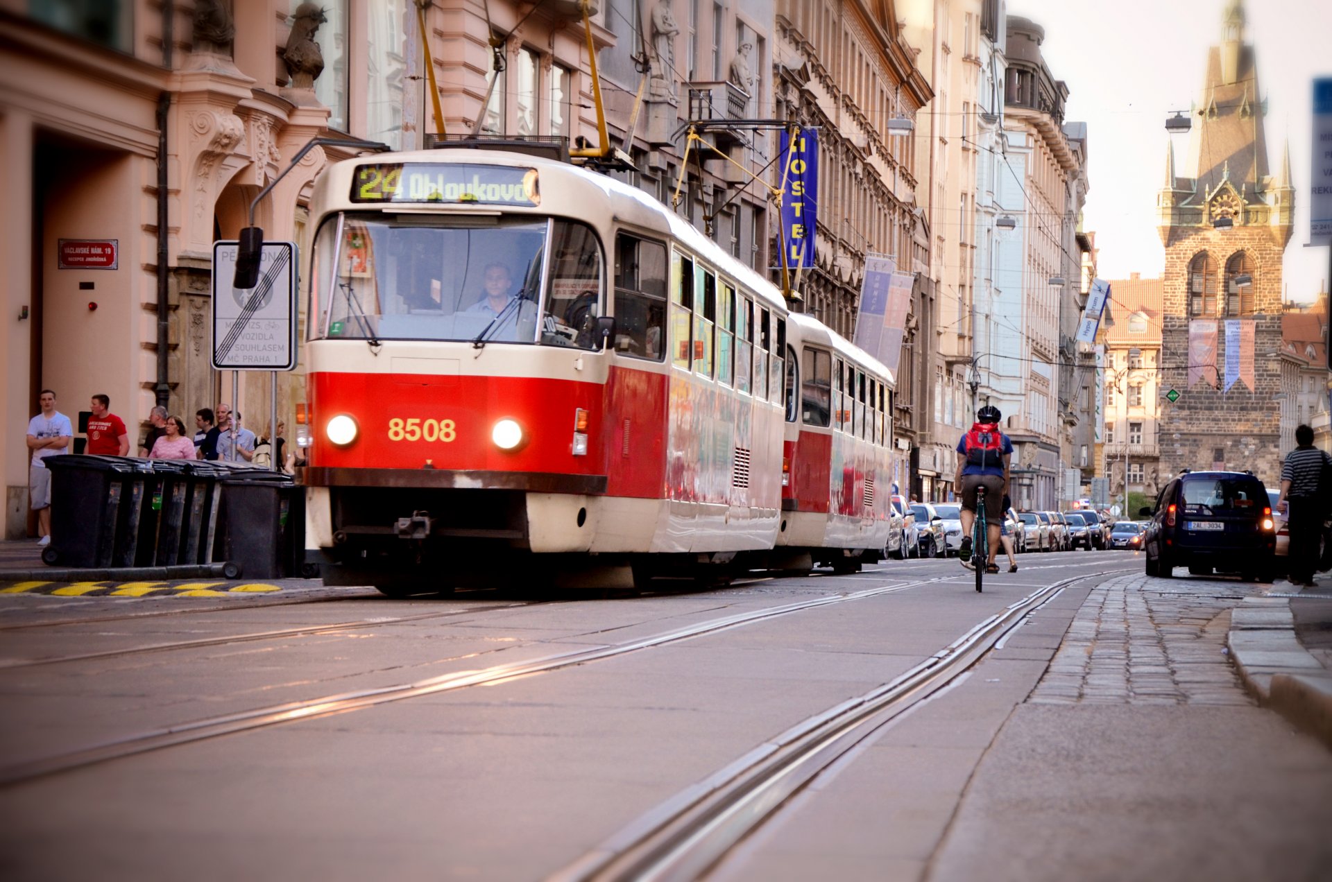 Красный трамвай в праге на фоне вышка