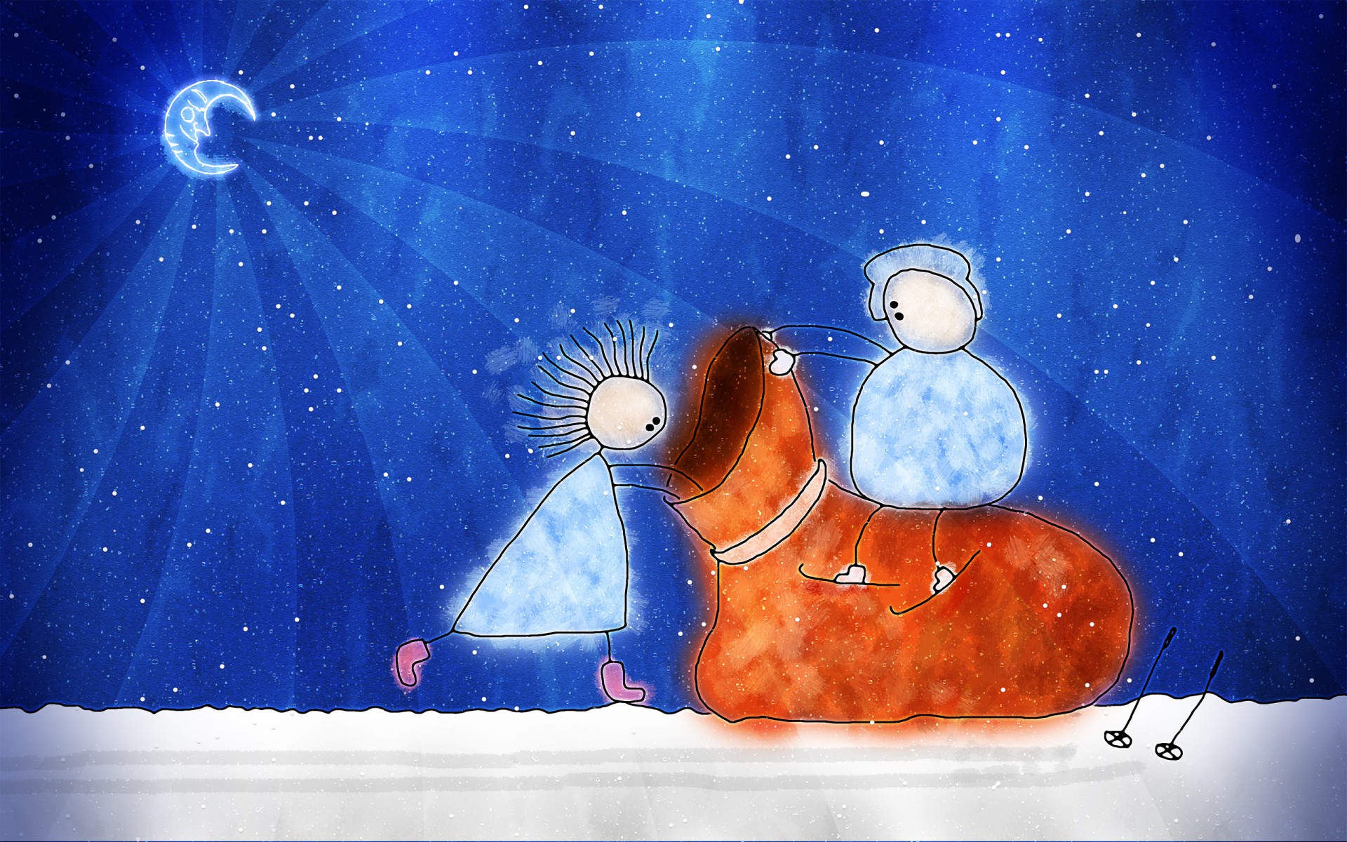 Два мультяшных человека играют с мешком для подарков под ночьной луной