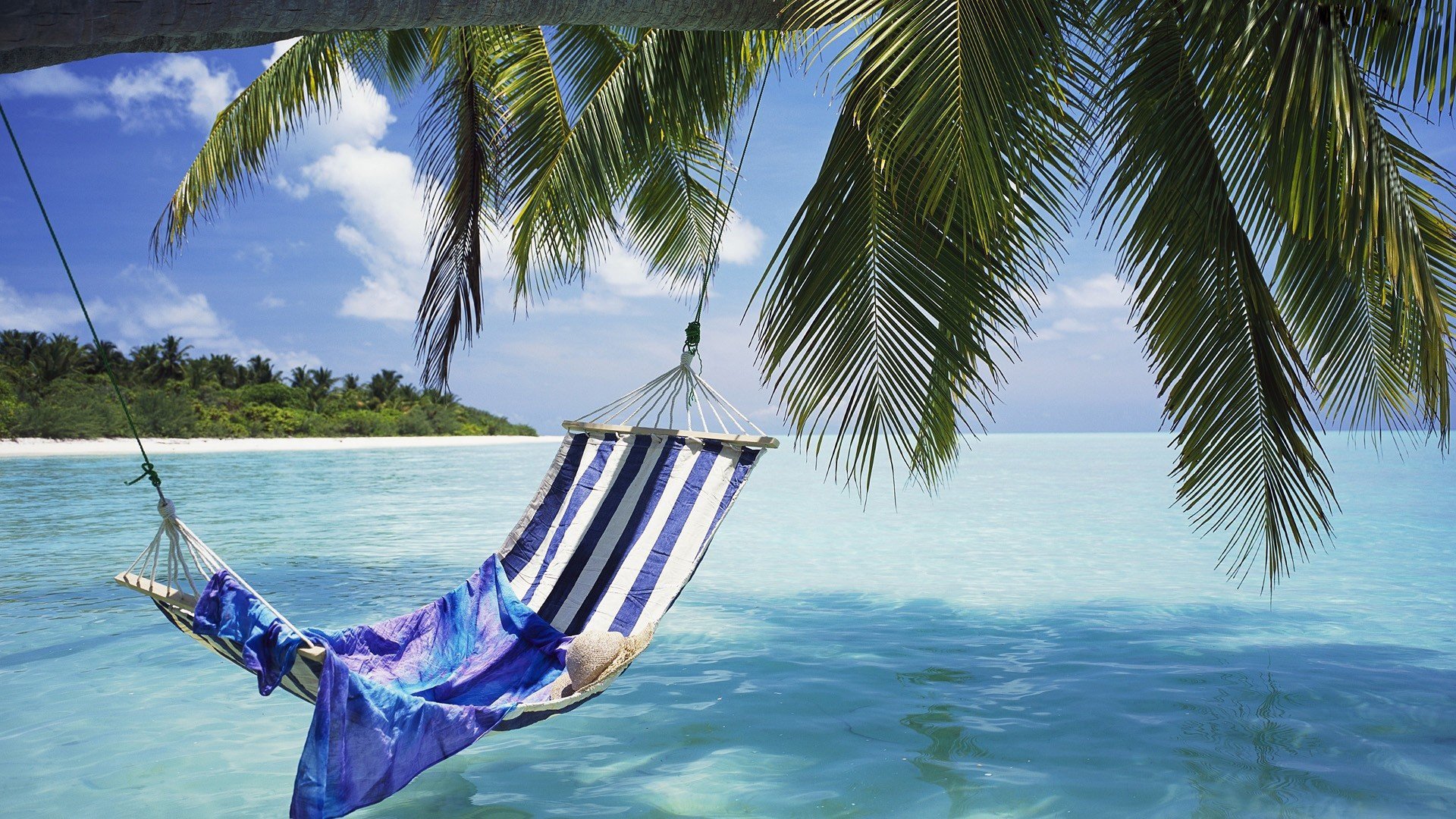 Гамак на песчаном пляже на берегу океана на фоне закатного солнца