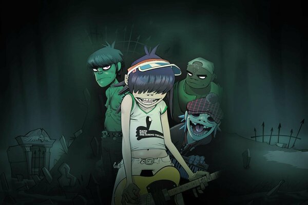 Персонажи 2d-мультфильма "gorillaz" на кладбище