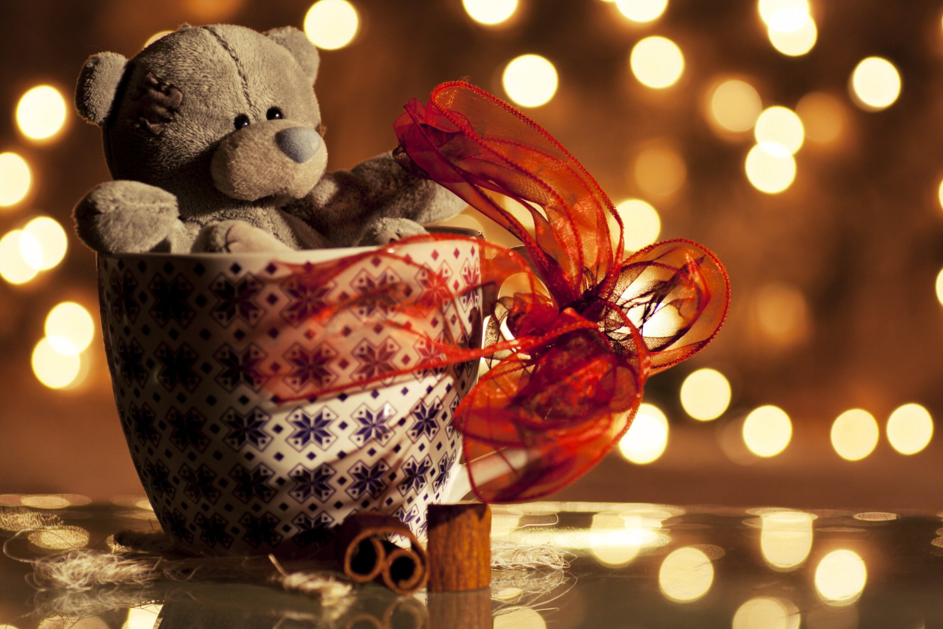 Плюшевый мишка, упакованный в горшок с красной подарочной лентой