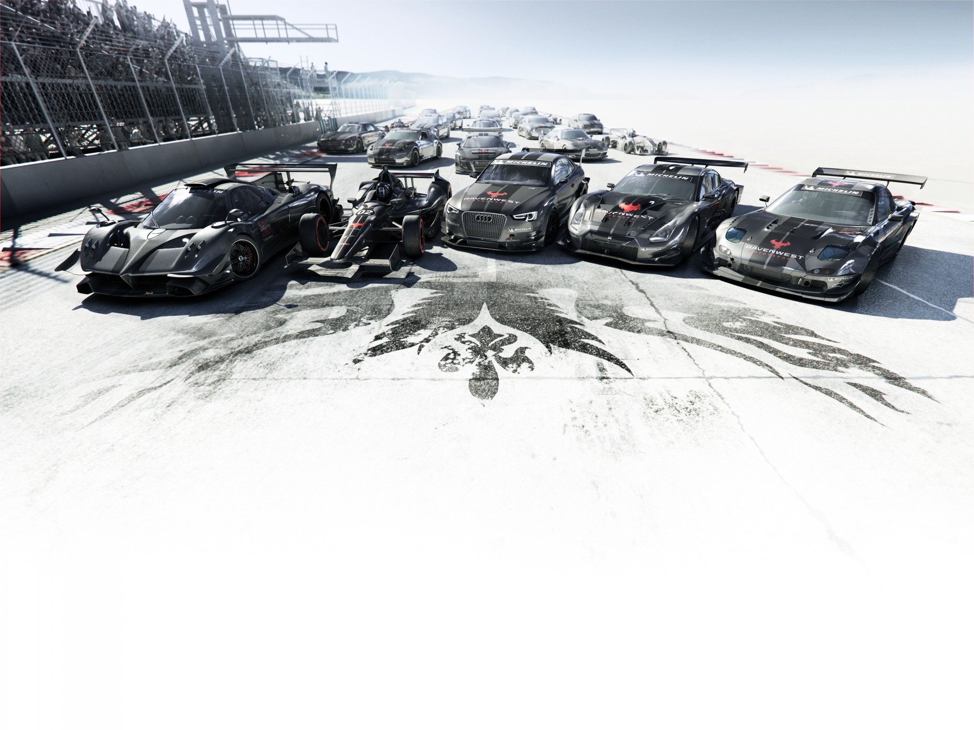 Машины снареженные двигателеми скоростными на фоне государственного герба