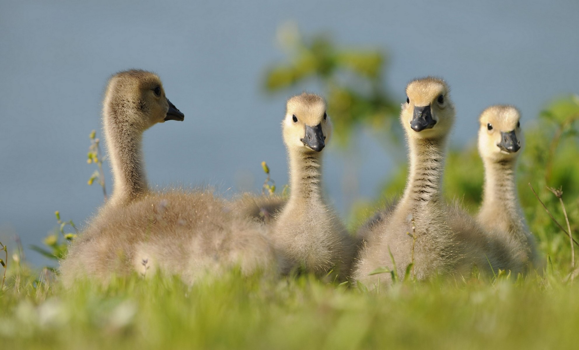 Яркое солнце светит на маленьких гусят