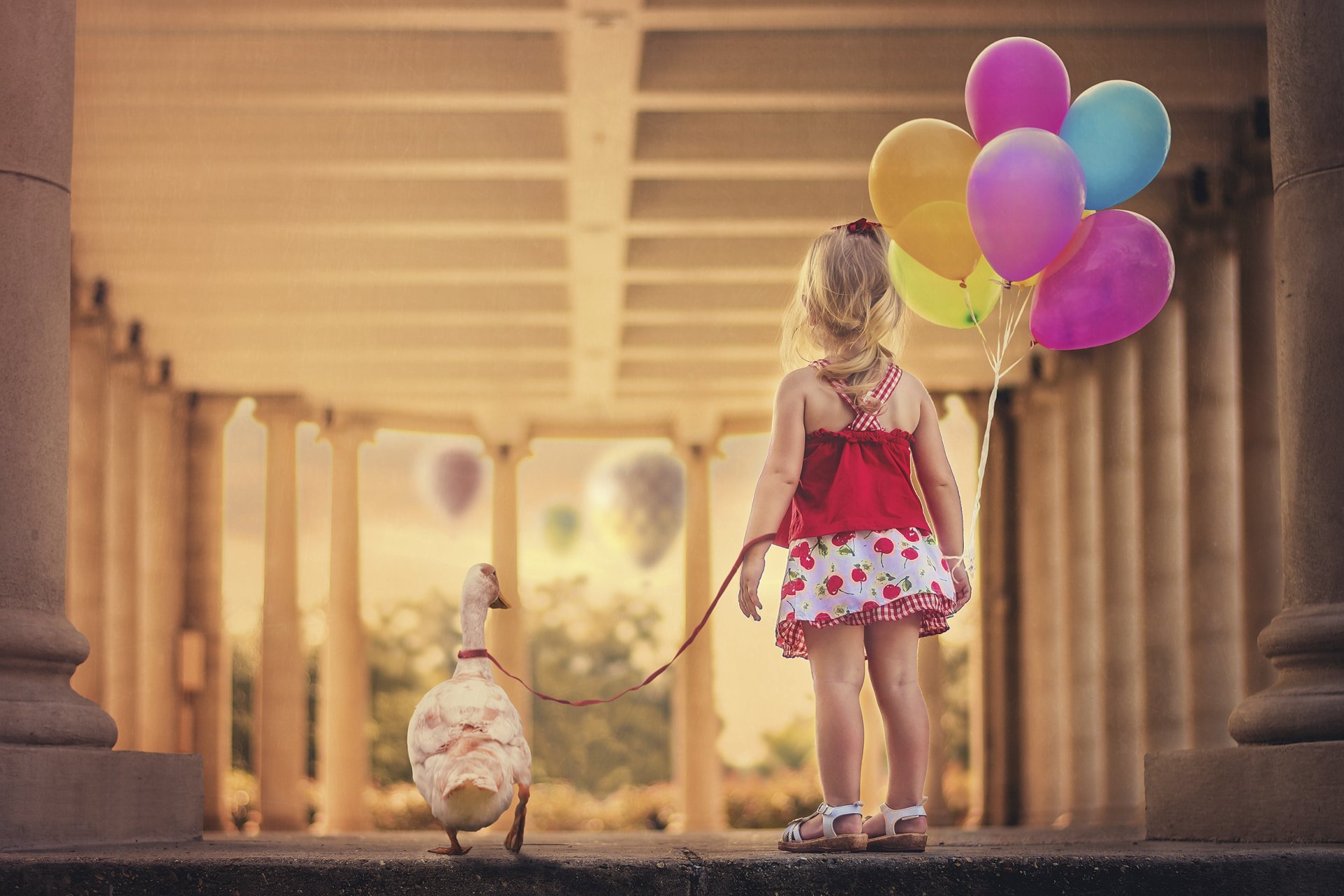 Маленькая девочка в платье с ягодами держит на красном поводке гуся и разноцветные шарики