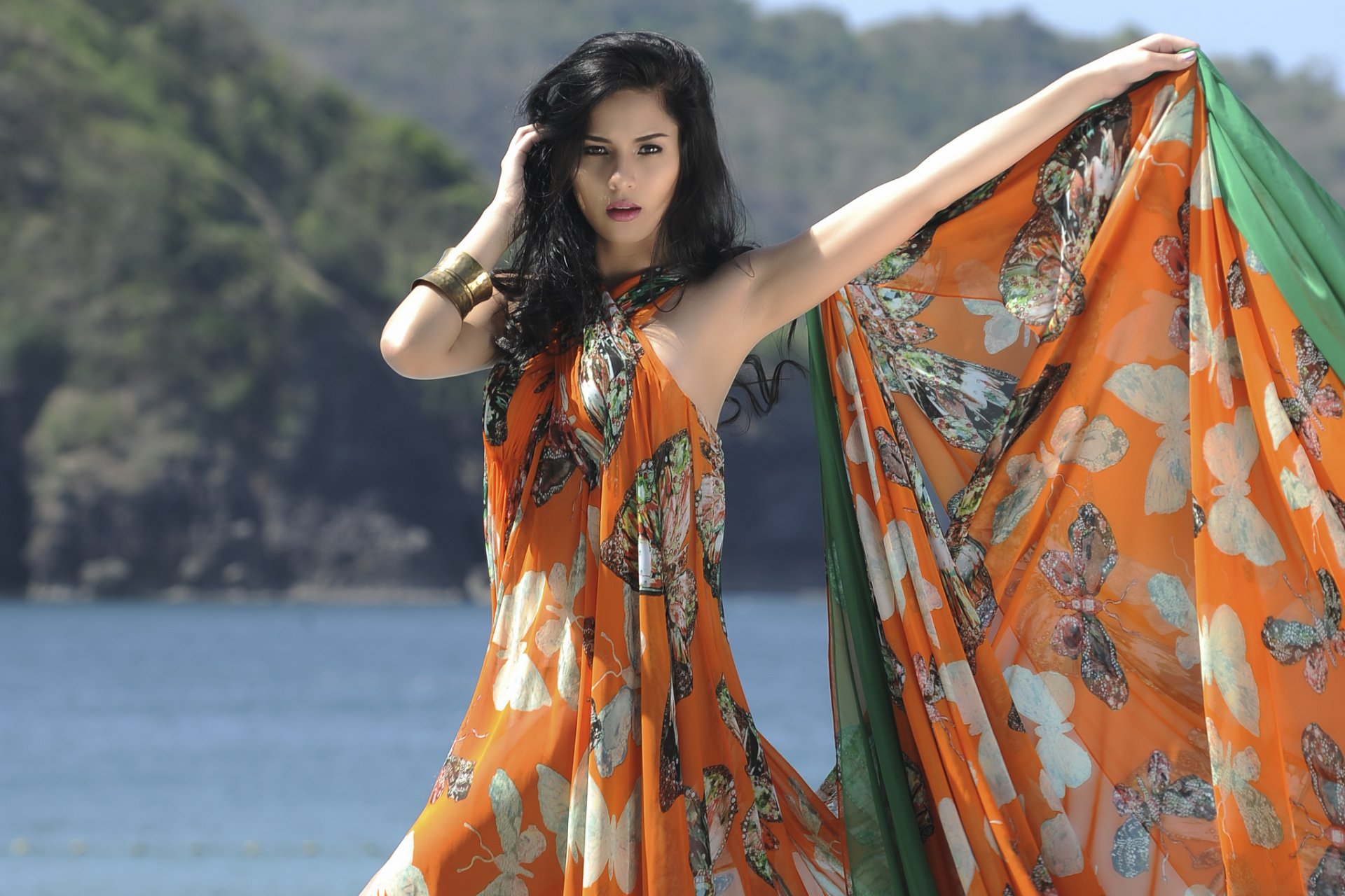 Модель девушка в платье на фоне моря