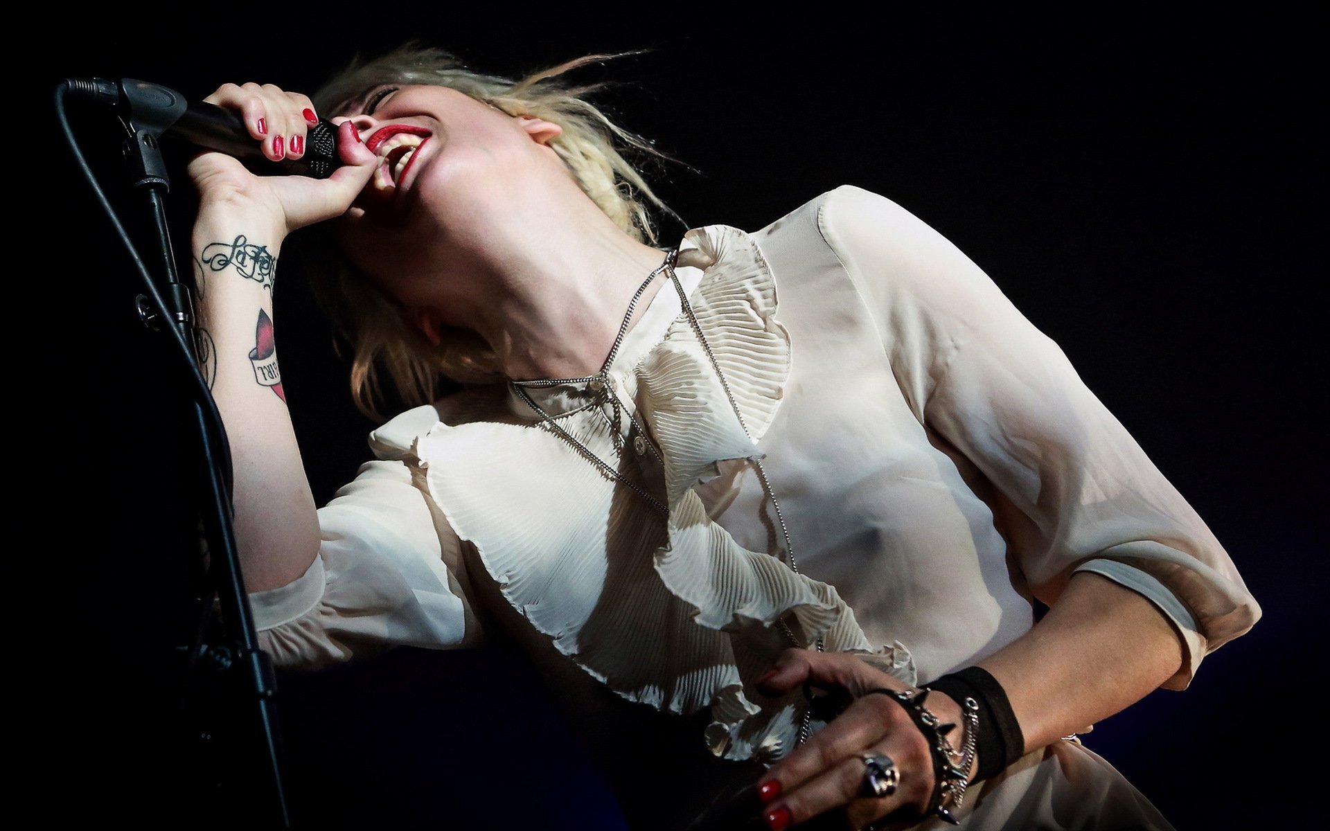 Деми Mondaine поёт в микрофон на тёмном фоне