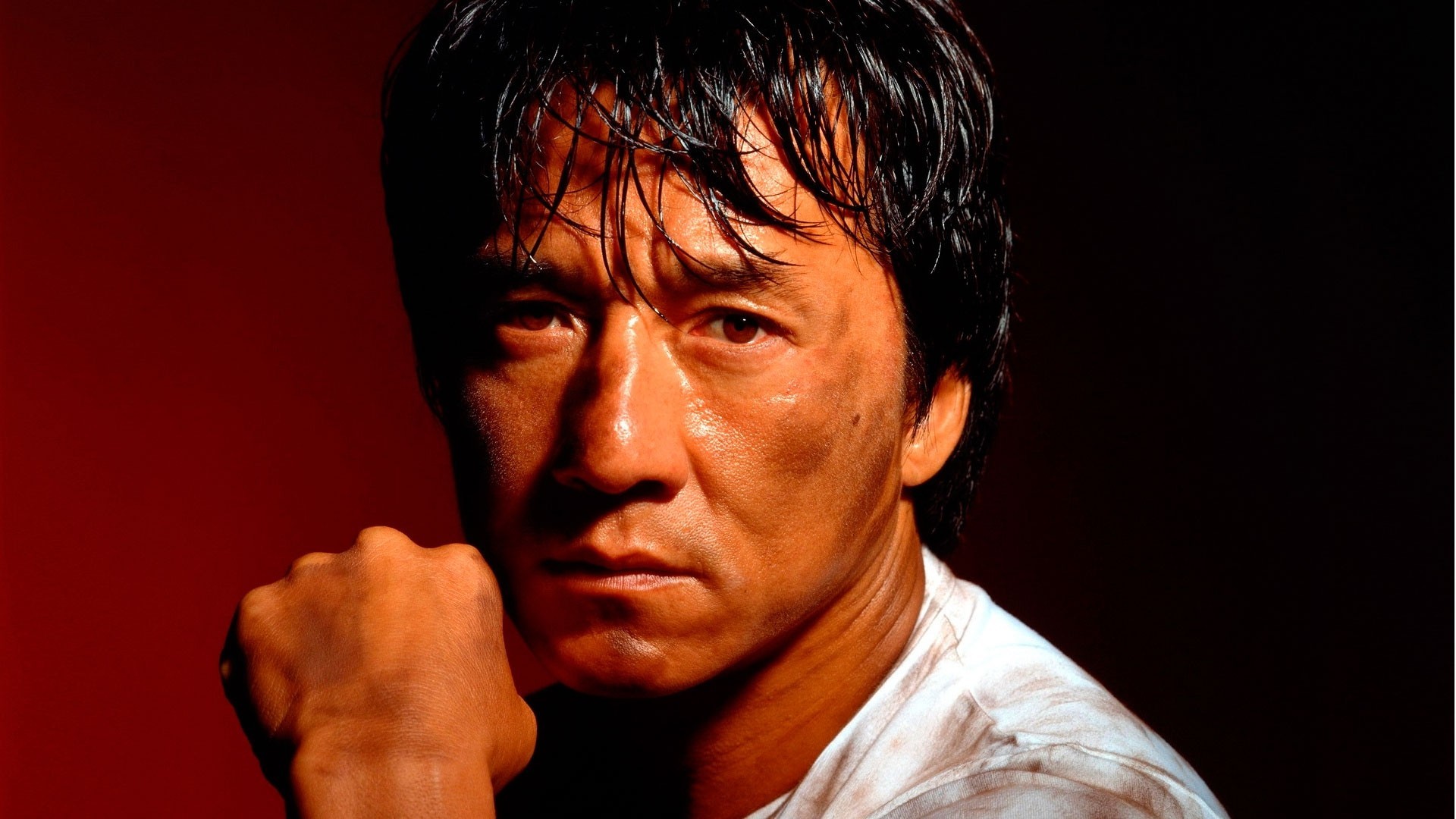 Джеки чан держит в руках фотоаппарат на чёрном фоне