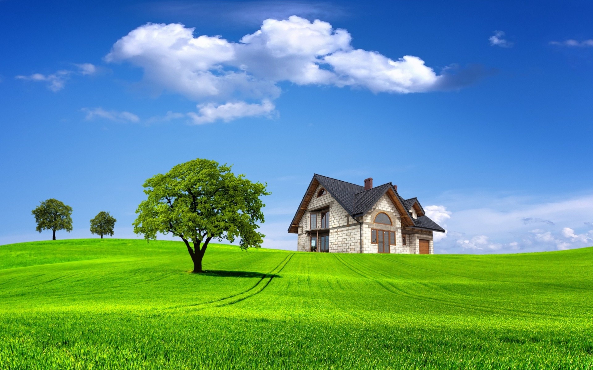Дом на фоне зелёного поля и голубого неба
