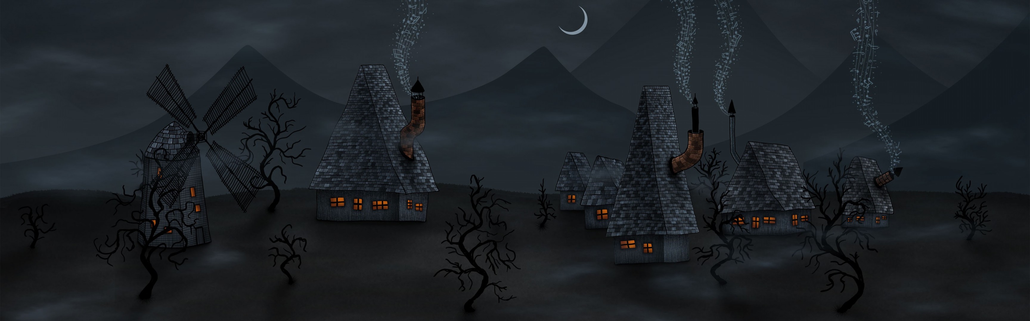 Мельница в нарисованной ночной деревне, где в домах горит свет и из труб клубится дымок