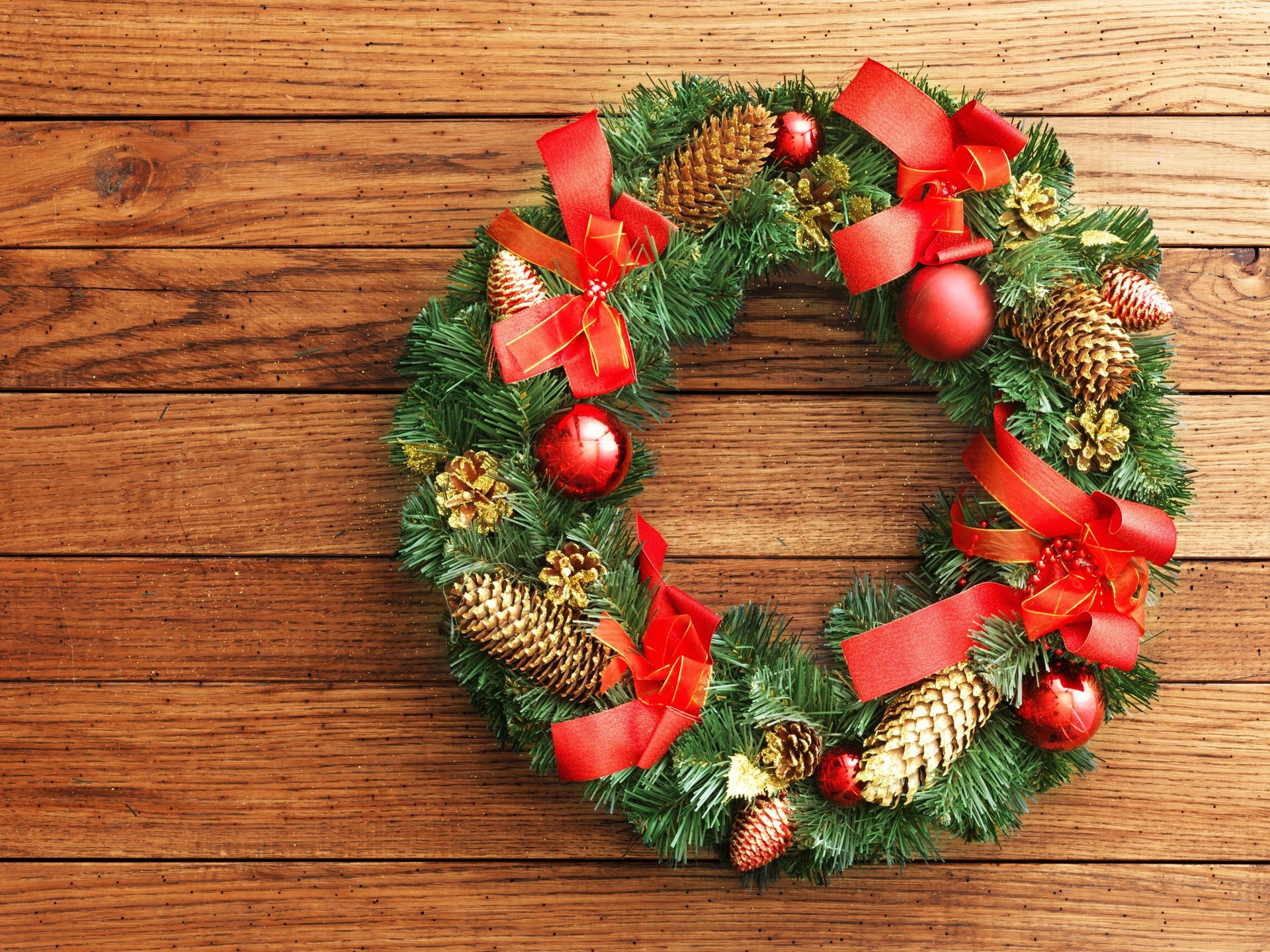 Еловый венок с бантом украшает дверь на новый год