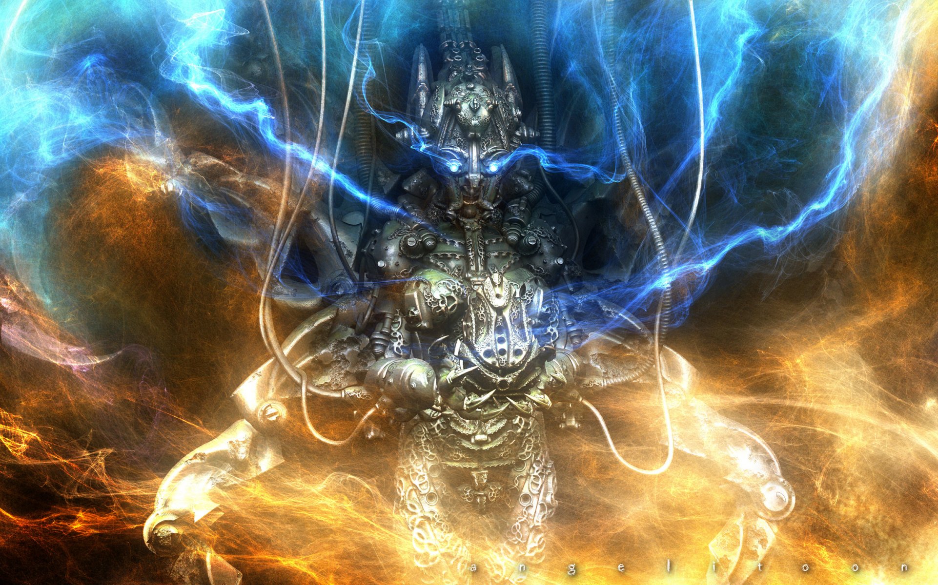Робот в шлеме. Синие разряды молнии