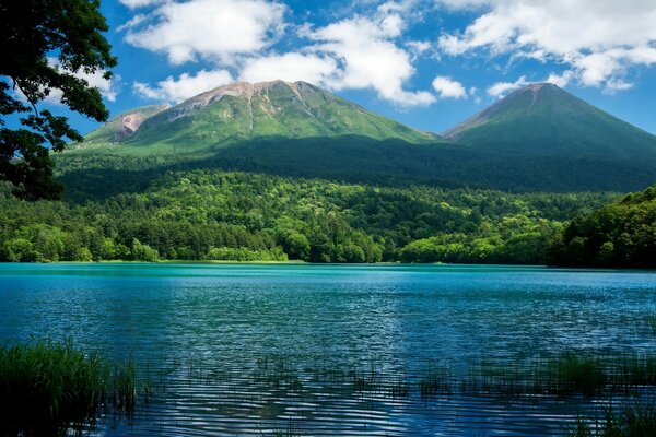 Панорама зеленых гор и холмов с лесной долиной и водной гладью