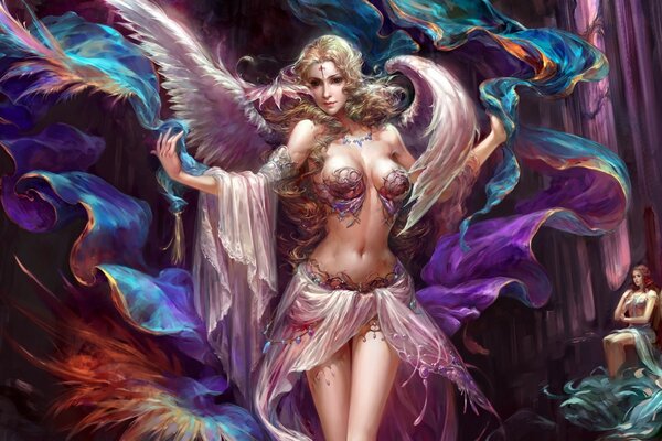 Девушка-ангел с крыльями смотрит на зрителя
