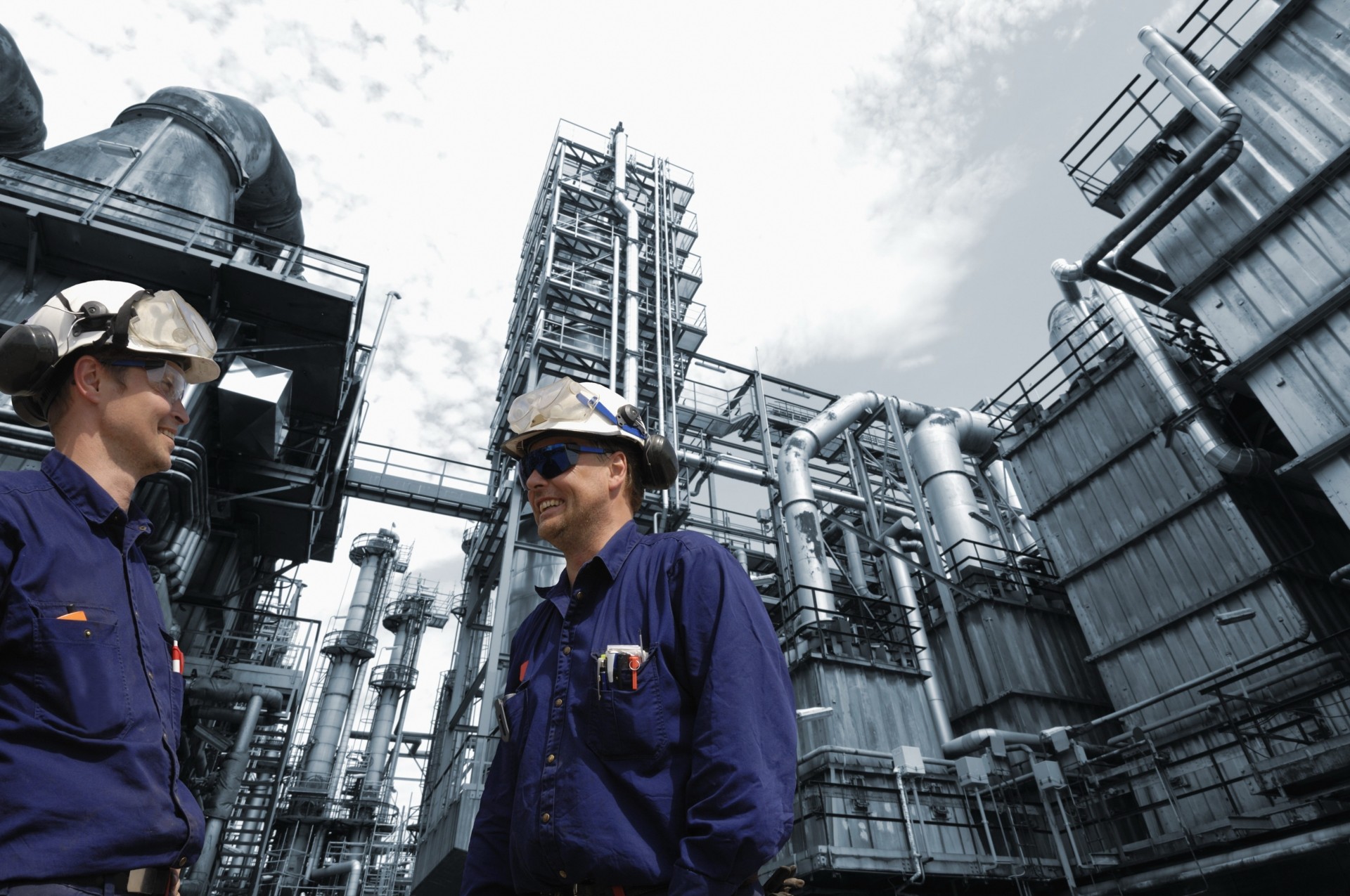 Инженеры на работе. Мужчины в форме на фоне индустриальной постройки