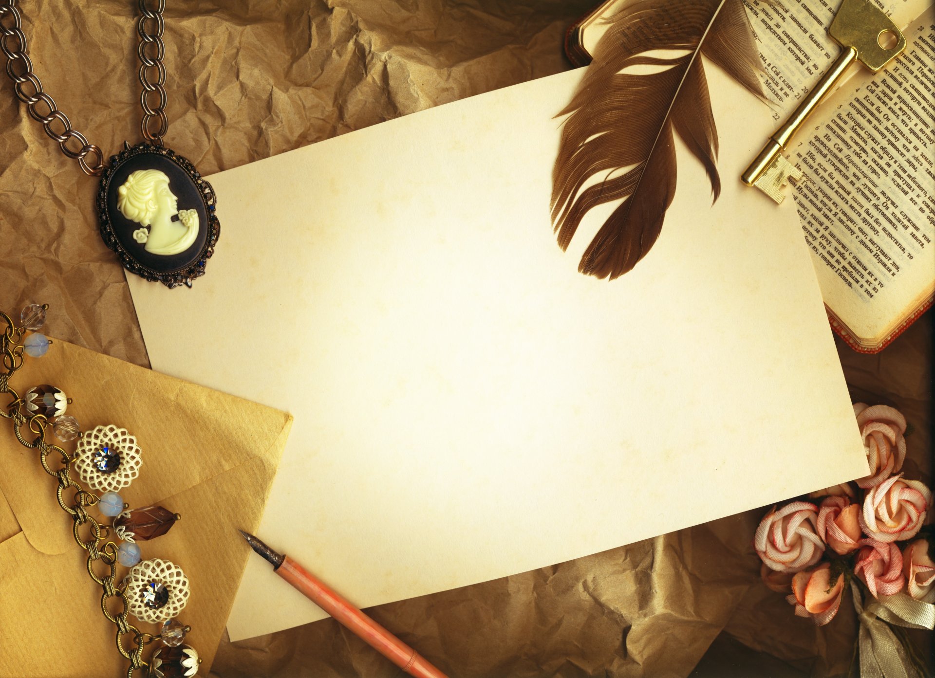Чистый лист белой бумаги, книга, перо, камея и ключ