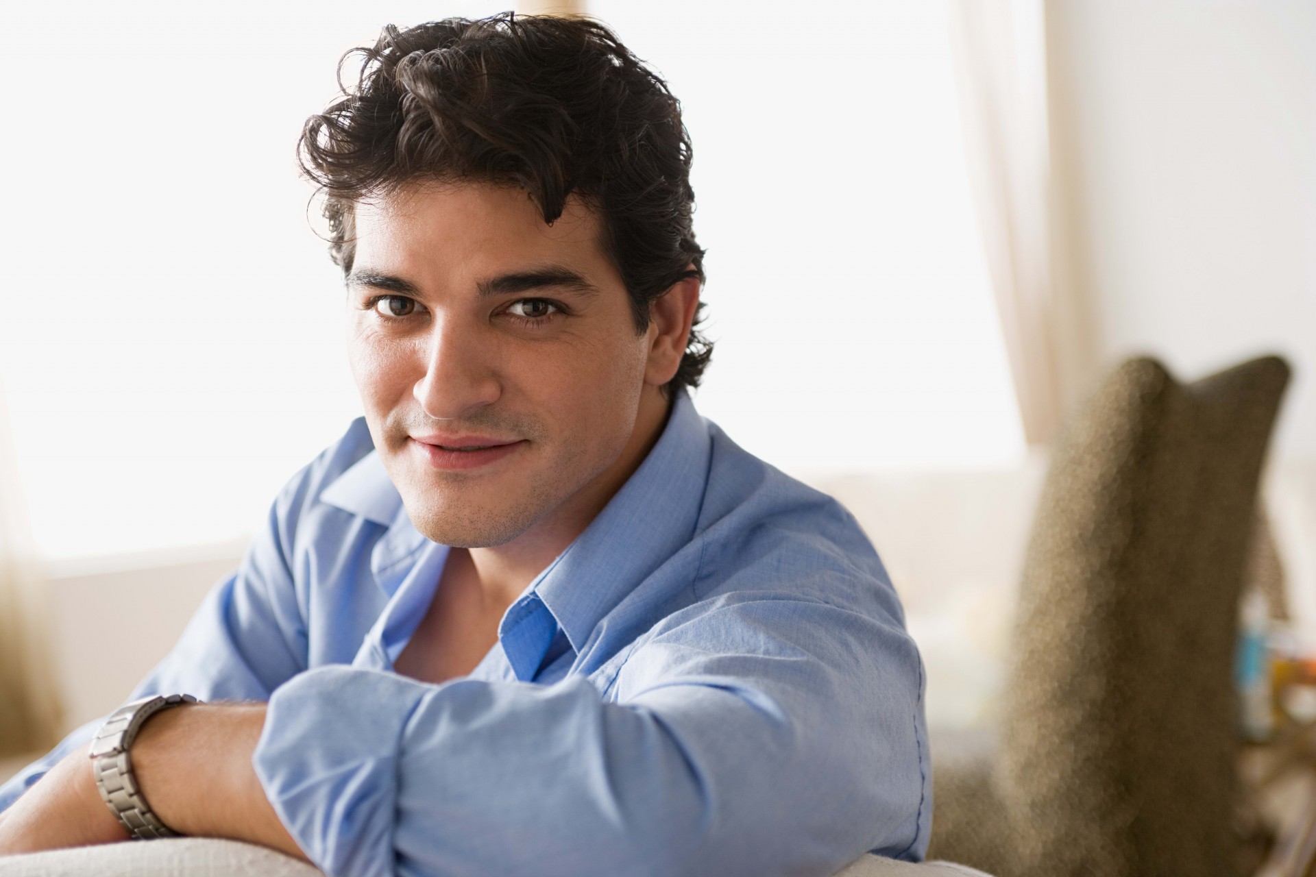 Симпатичный брюнет с карими глазами улыбается и смотрит в камеру