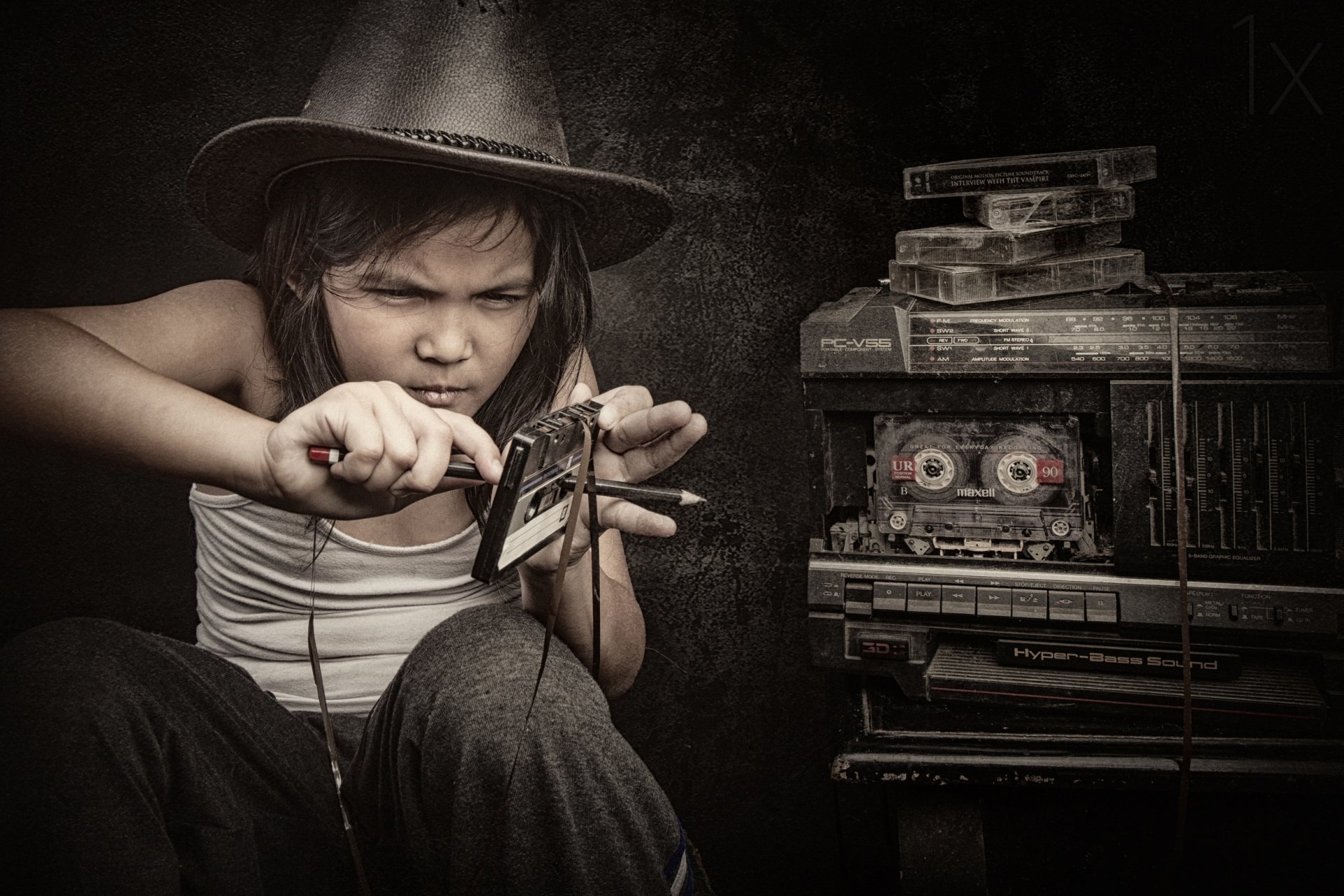 Девочка - подросток перематывает касету карандашом