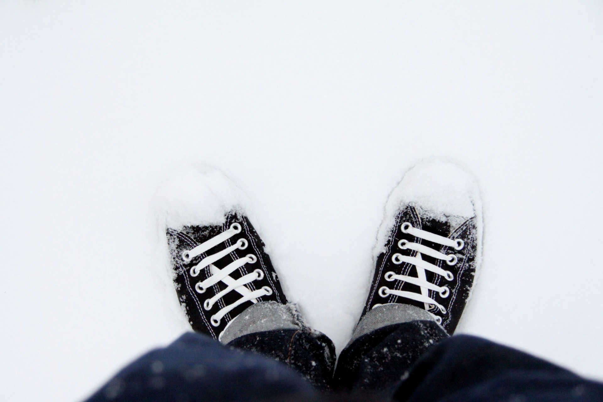 Девушка в шляпе завязывает желтые кеды на лестнице