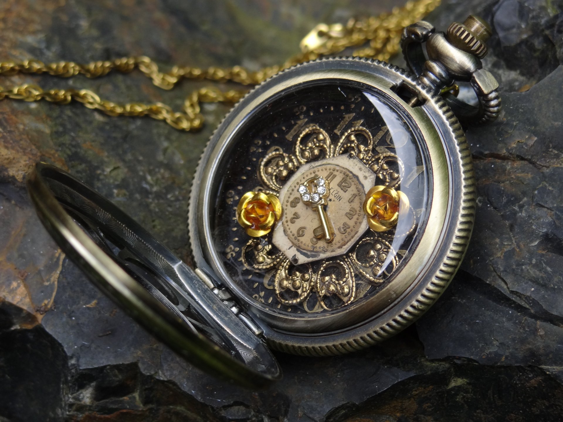 Старинные часы стоящие на столе. Рядом лежат карманные часы и старый ключ