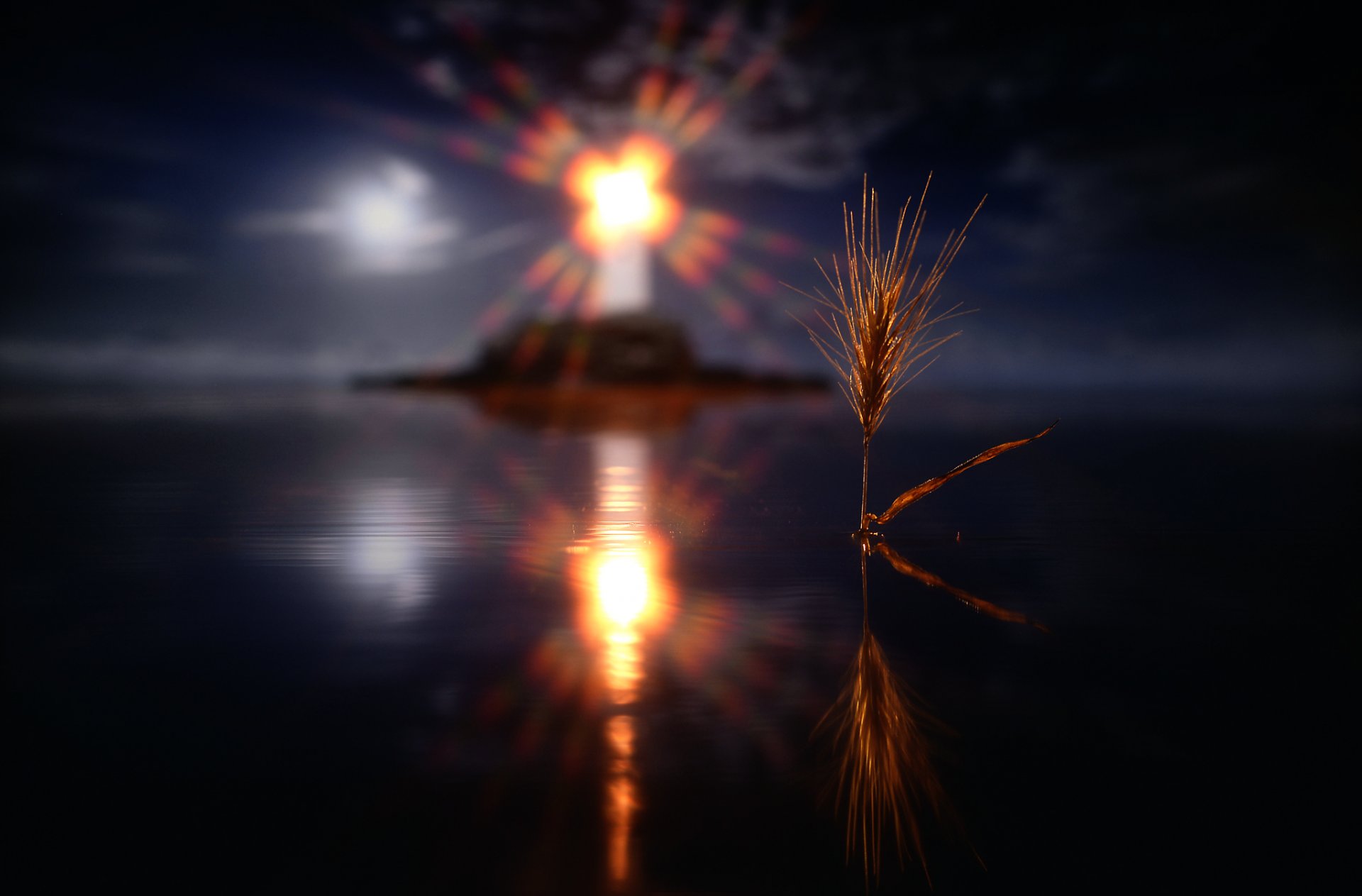 Колосок освещенный светом маяка в ночное время