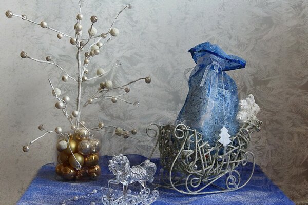 Стеклянная коняшка, голубой мешочек , перевязанный ленточкой в санках, белые бусы, инсталляция ёлки в банке с золотистыми новогодними шарами на сине-белой скатерти на фоне серой стены