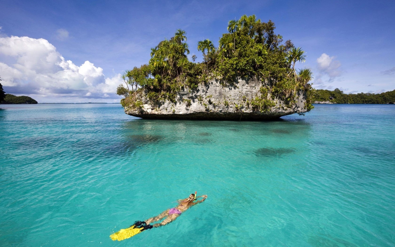 Отпуск на курорте туриста- водолаза в морской воде с пейзажем на природу, небо, прозрачные глубины