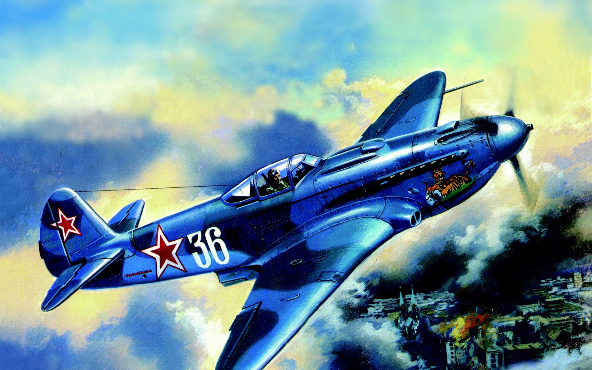 Советский истребитель над задымленном городе