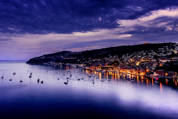 Фонвей, княжество Монако. Вечерний город на лазурном берегу, окруженный водой, на фоне гор