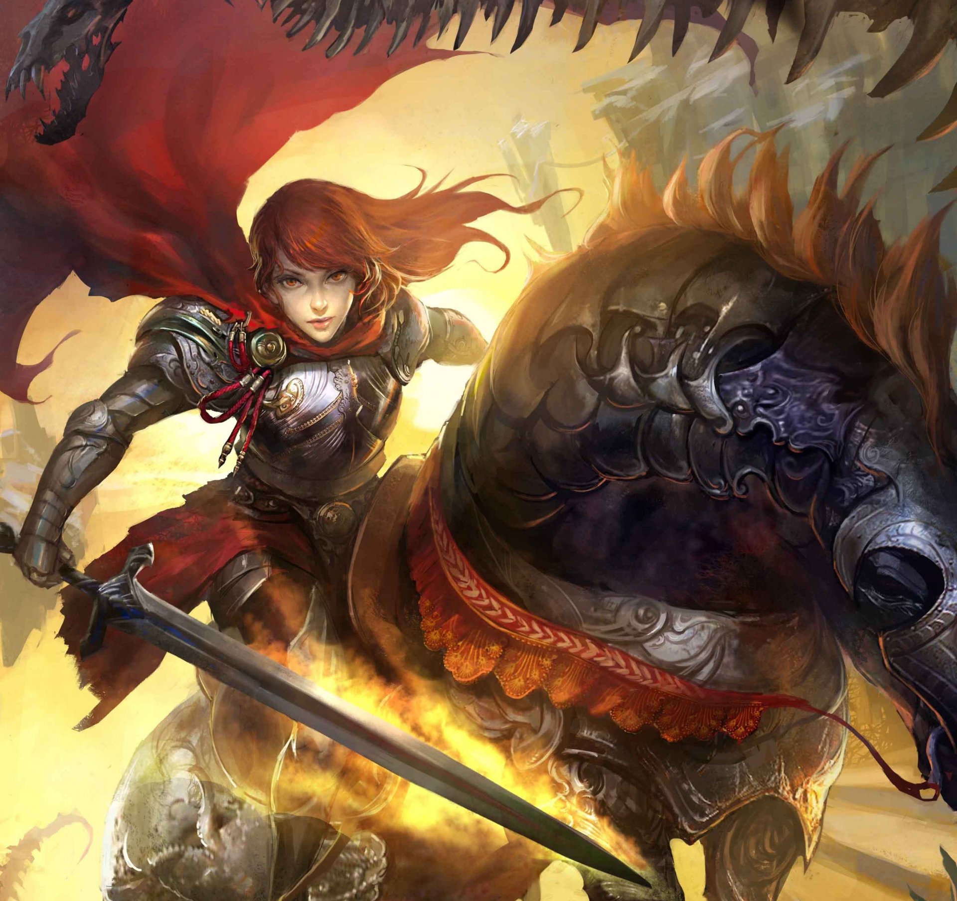 Арт, легенда cryptids девушка на могучем коне с мечом