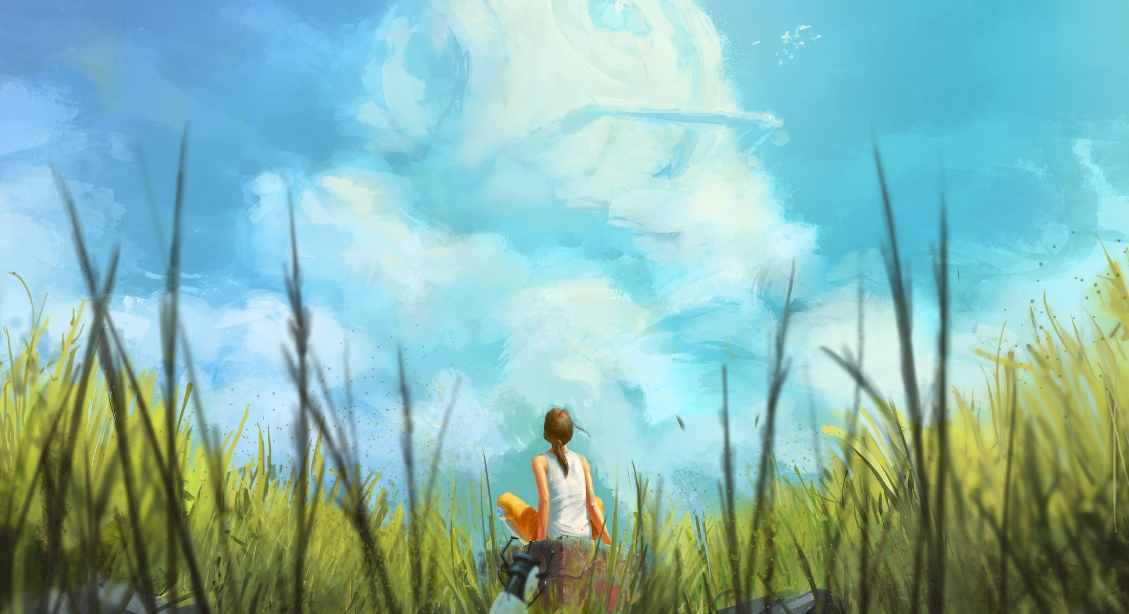 Поле разноцветных тюльпанов и голубое небо с облаками