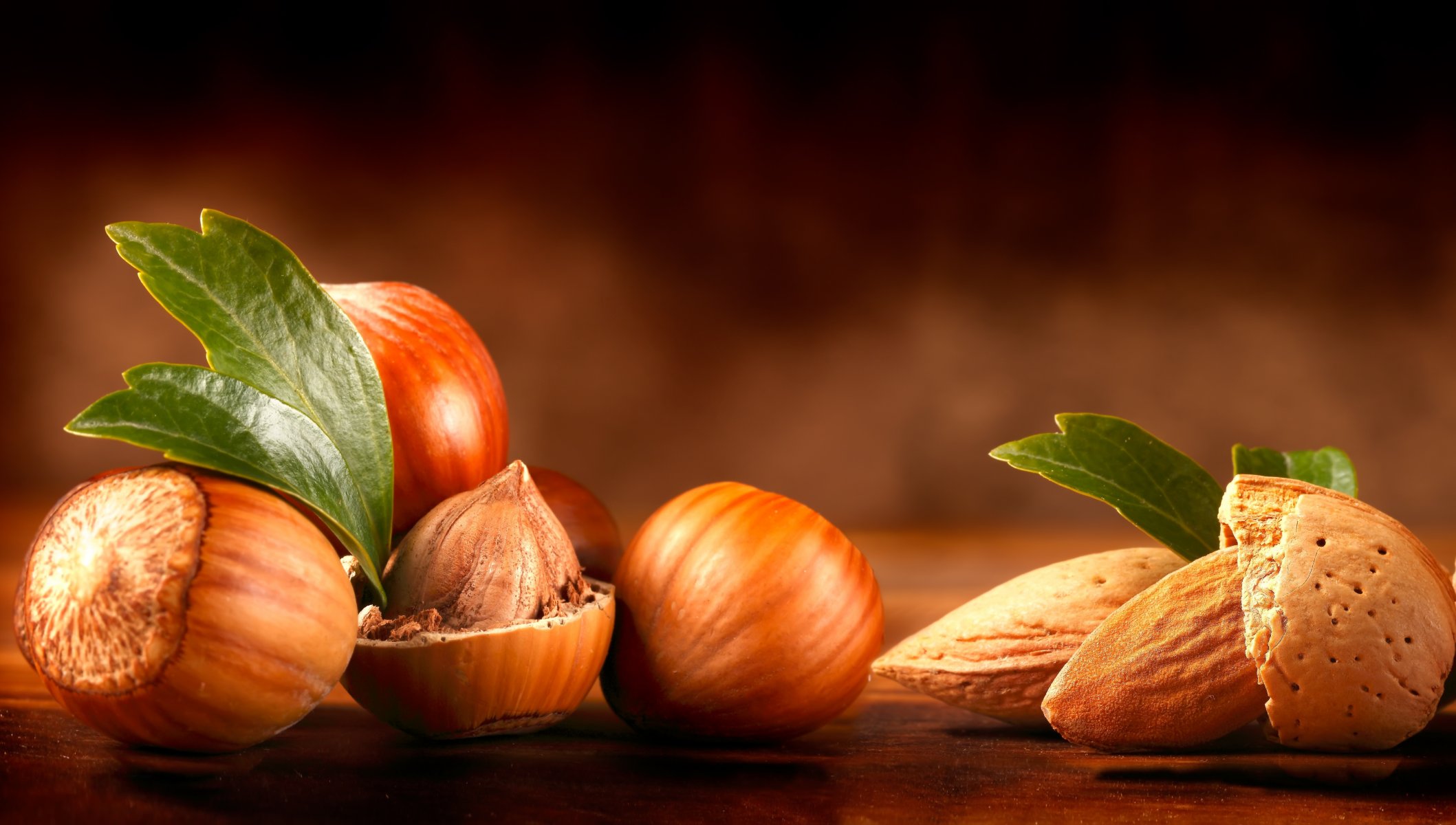 Лесные орехи и миндаль с листочками на столе