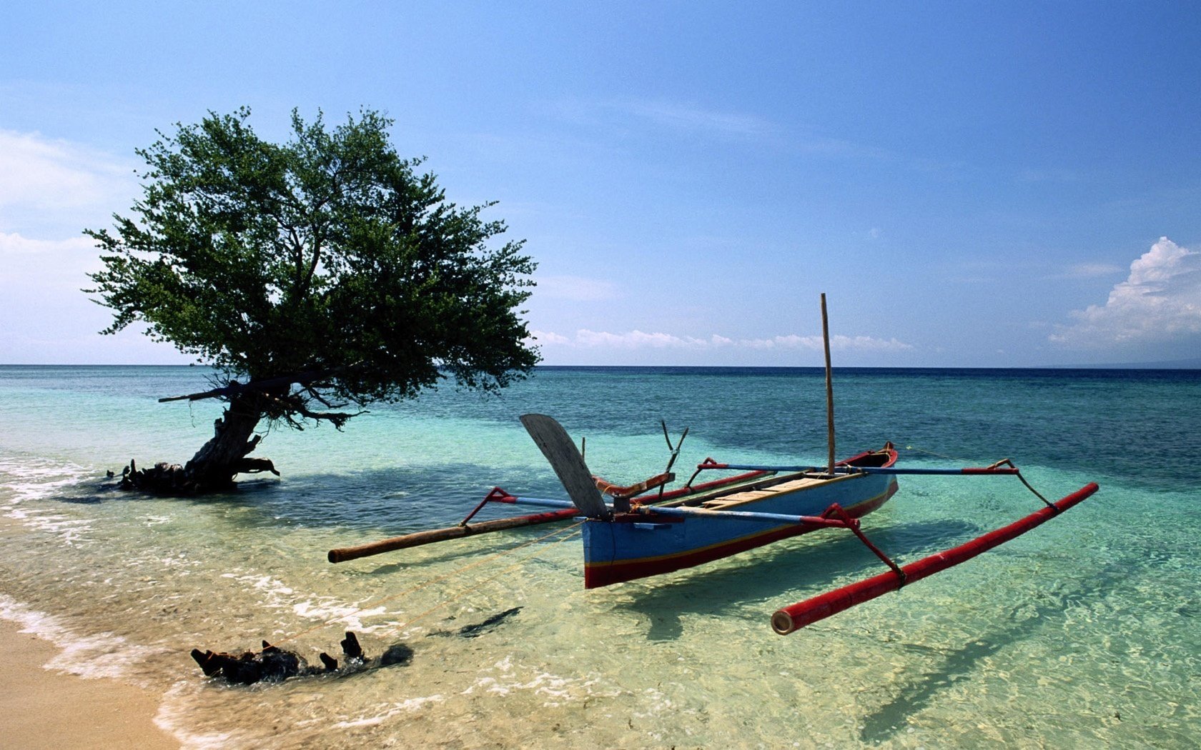 Лодка на прозрачной морской воде у берега на фоне синего неба и зелёной растительности