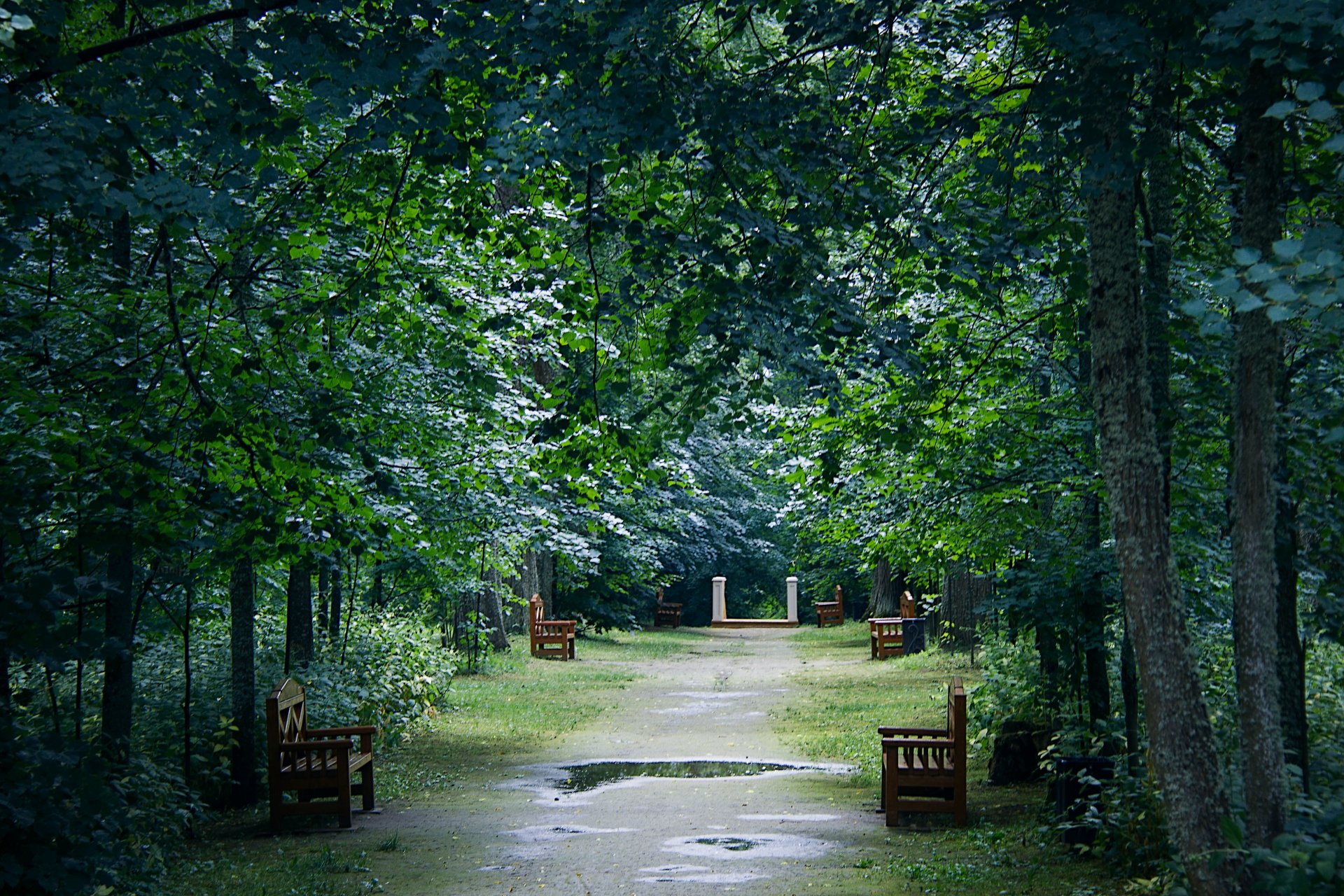 Отражение спокойствия в луже у скамейки в парке после дождя